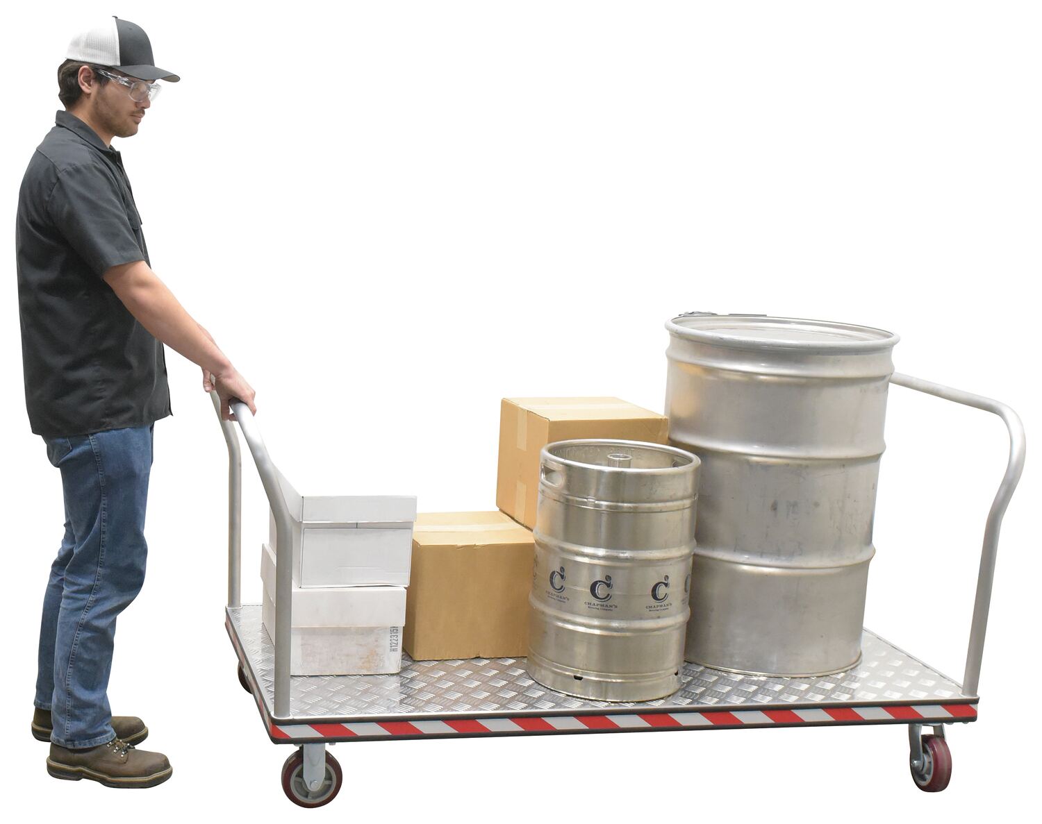 An aluminum tread plate platform truck is a great addition a variety of settings. Fitted with non-marking rubber protective buffer strip to protect walls and door frames during transit. Design allows items to be loaded and unloaded from multiple sides. The poly-on-poly casters roll smoothly over surfaces.