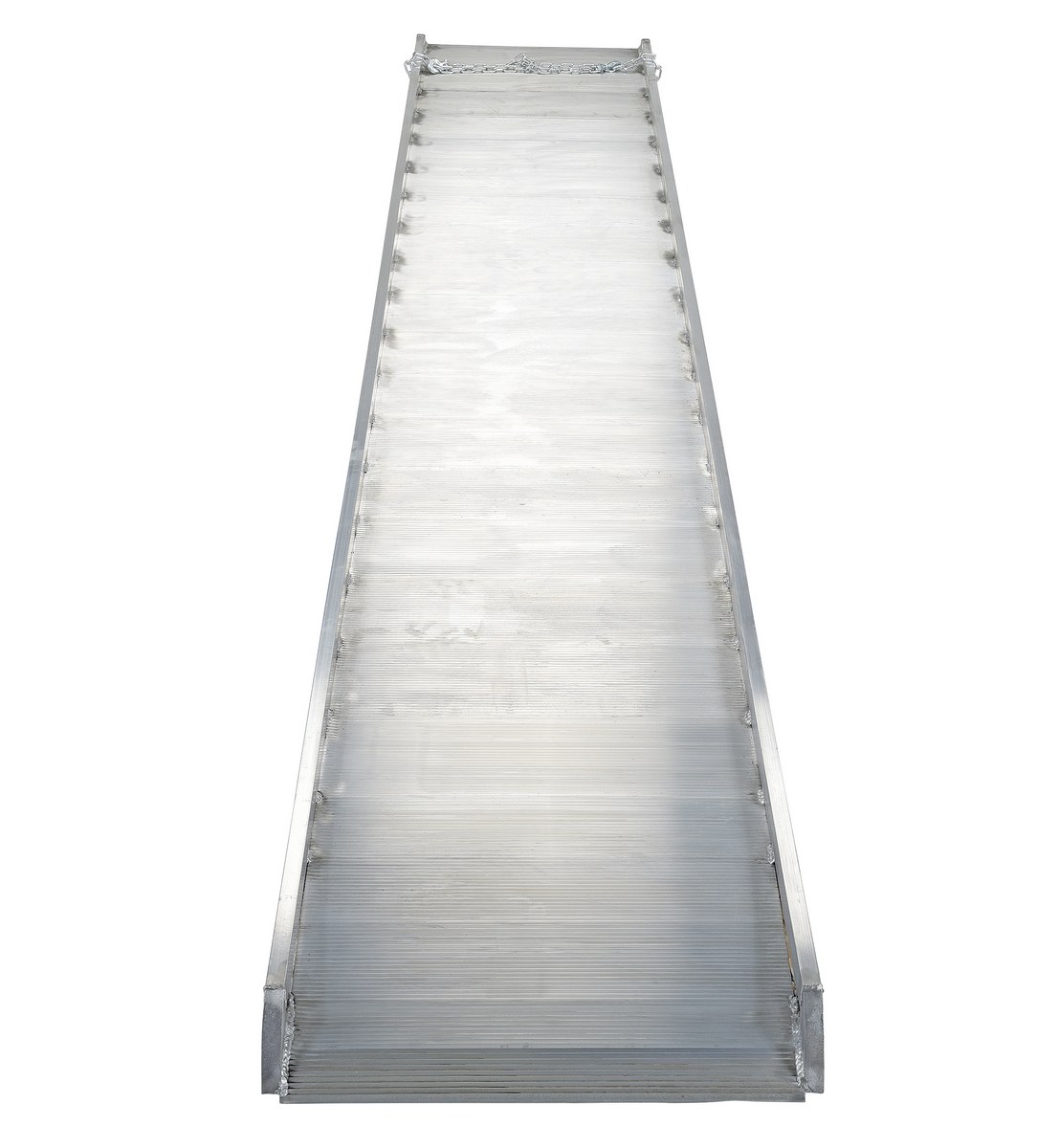 The Aluminum Walk Ramp enables delivery men/women, shippers, and receivers to load and unload trucks when docks are unavailable. Heavy-duty steel chains with steel grab hooks are attached to each side of ramp for safely securing ramp to truck. Constructed of strong aluminum alloy with non-skid tread surface. The ramp is lightweight and easy to handle. This overlapping style rests on the truck bed.