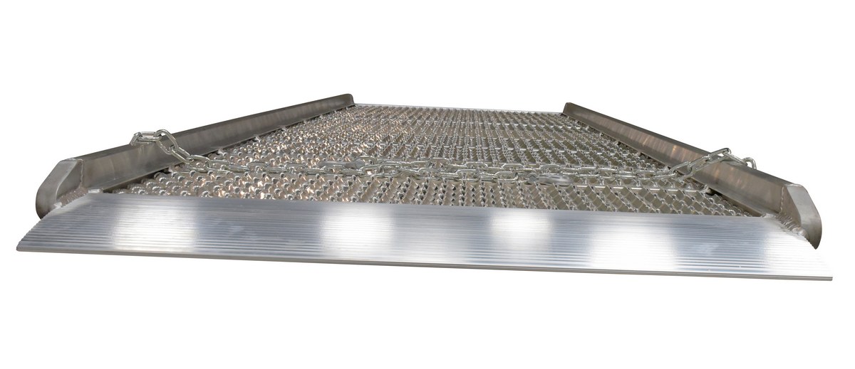 Load and unload trucks when docks are unavailable with the Aluminum grip-strut Walk Ramp. The open deck design allows snow, ice and water to fall through ramp providing a positive grip for delivery men/women, shippers and receivers. One hundred (100) percent welded aluminum construction is lightweight and will not rust. Overlap style end lip rests on the trailer bed to provide a smooth transition. Each unit includes two safety chains to connect the ramp to the trailer for safety. Not for pallet trucks or three wheel carts.