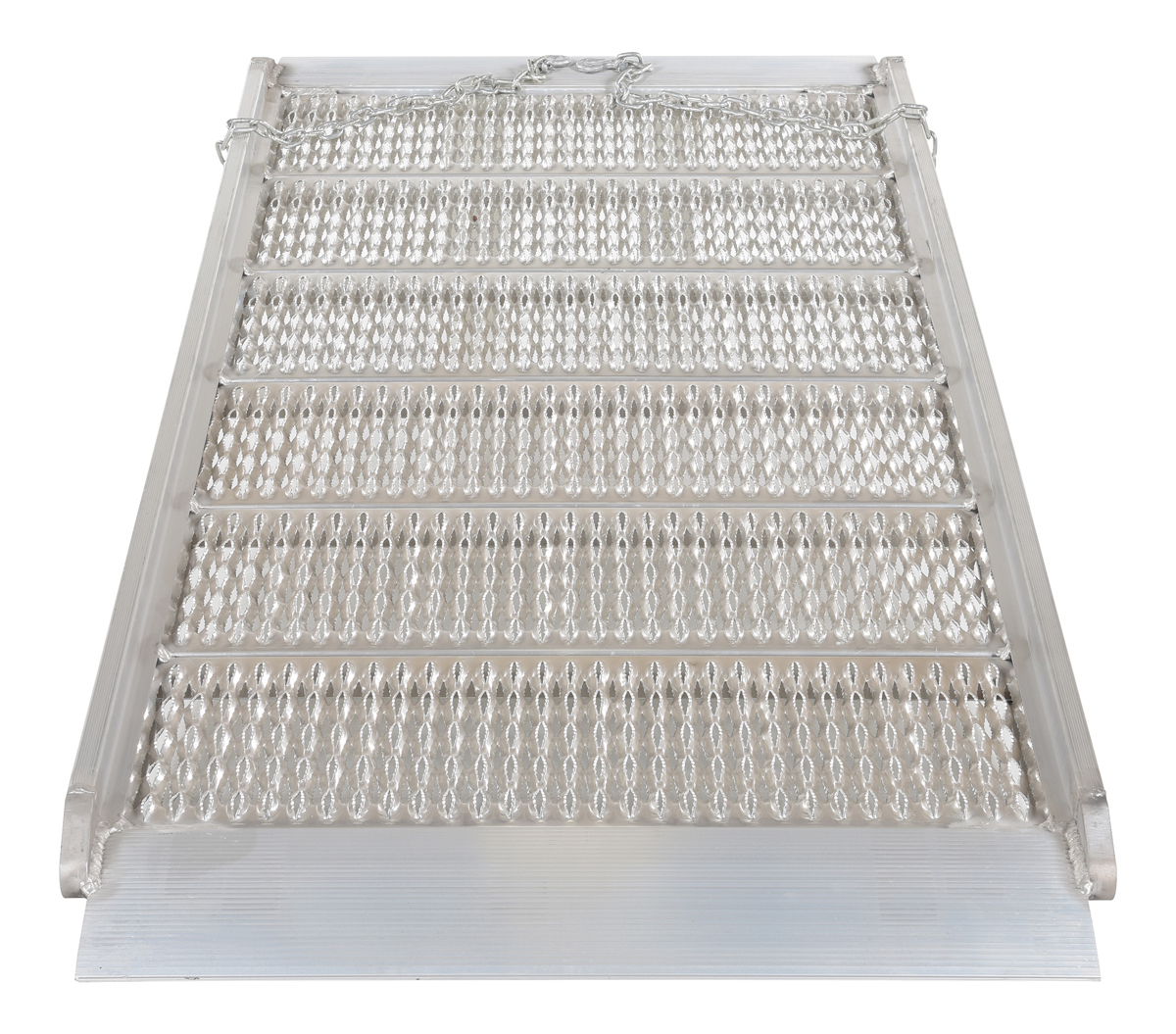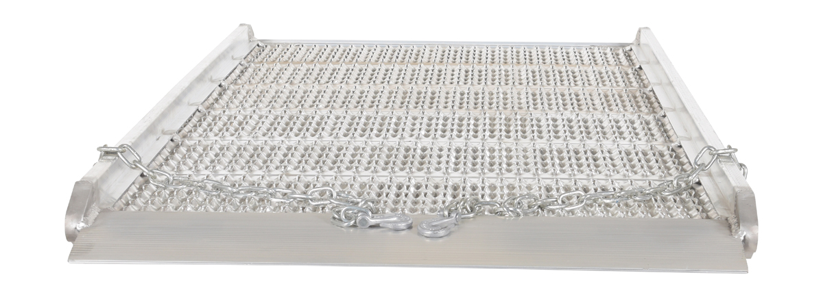 Load and unload trucks when docks are unavailable with the Aluminum grip-strut Walk Ramp. The open deck design allows snow, ice and water to fall through ramp providing a positive grip for delivery men/women, shippers and receivers. One hundred (100) percent welded aluminum construction is lightweight and will not rust. Overlap style end lip rests on the trailer bed to provide a smooth transition. Each unit includes two safety chains to connect the ramp to the trailer for safety. Not for pallet trucks or three wheel carts.