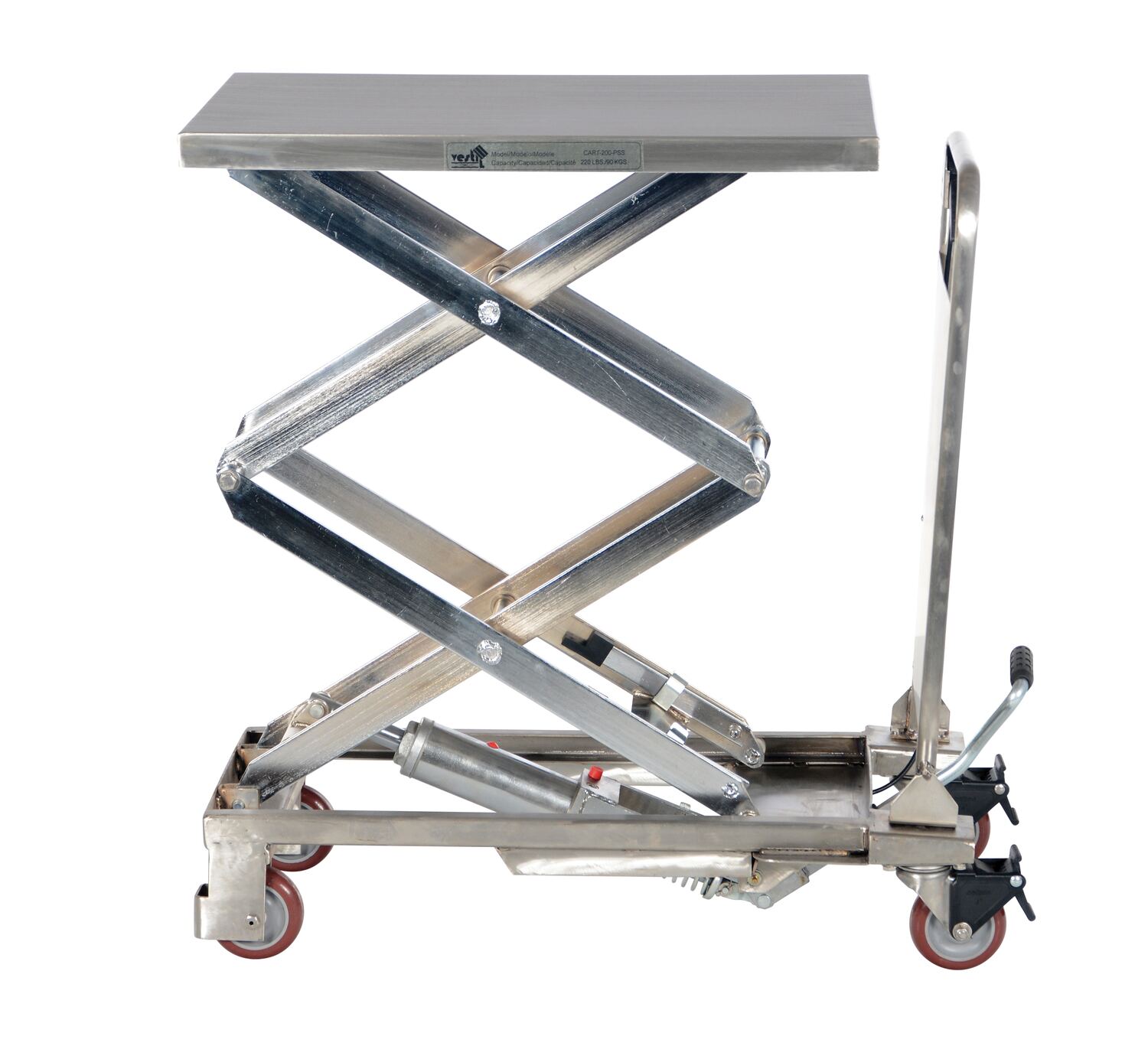 The partially Stainless Steel Hydraulic elevating cart is available for transport heavy loads in lab, food service and health care applications. Not suitable for wash-down applications. The platform. Handle, base frame, caster rig and hardware are 304 grade stainless steel. Foot operated hydraulic pump raises platform. To lower unit use the hand-operated release. The wheels are poly-on-poly. Features an internal safety velocity fuse in each cylinder.
