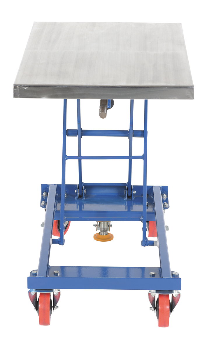Steel Mechanical Scissor Cart with Hand Crank 17-3/4 In. x 27-1/2 In. 330 Lb. Capacity Blue/SilverWhen lifting and transporting are both essential, look no further than the mechanical scissor cart. The centrally located hand crank allows the user to raise and lower the platform to a more exact level. A large platform gives the ability to load items in a variety of sizes. Since the platform can be maneuvered to a specific height, the unit can be positioned to best fit the users needs for a more ergonomically friendly experience. Poly casters are included for a smooth roll on a variety of surfaces.