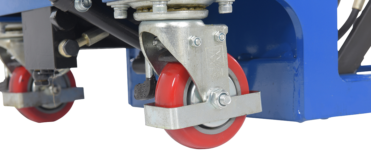 In areas of congestion a low profile scissor cart is a must. With a two speed auto shift foot pump, the platform is easily raised/lowered to the desired position. The auto shift automatically shifts between speeds based on the output pressure of the hydraulic system. Not only is this design extremely efficient but also ergonomically friendly. With a raised steering handle the user can maintain a proper working posture during transit. The sleek steel design, with a powder coated finish for baked in added toughness, is simple to clean and limits needless scuffs or abrasions. Mold on rubber casters with brakes roll easily over a variety of surfaces.