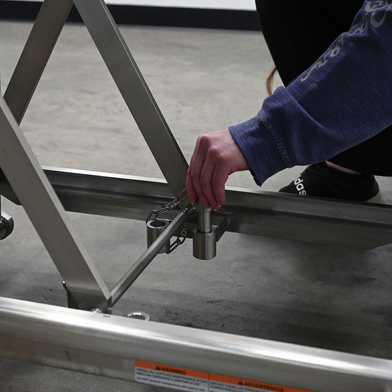 The Hydraulic elevating cart minimizes worker bending and lifting through its ergonomic design and portability. Material can be easily loaded onto a cart from a table, lowered to a safe transporting height, and raised to unload at destination. The foot pump includes a soft-lowering down valve. The unit moves easily on four polyurethane casters; two swivel with brakes and two rigid. Features a two-speed foot pump. Foot pump pedal, pump assembly and hydraulic cylinder are chrome plated. Rest of the unit is fully stainless construction. Features an internal safety velocity fuse in each cylinder.