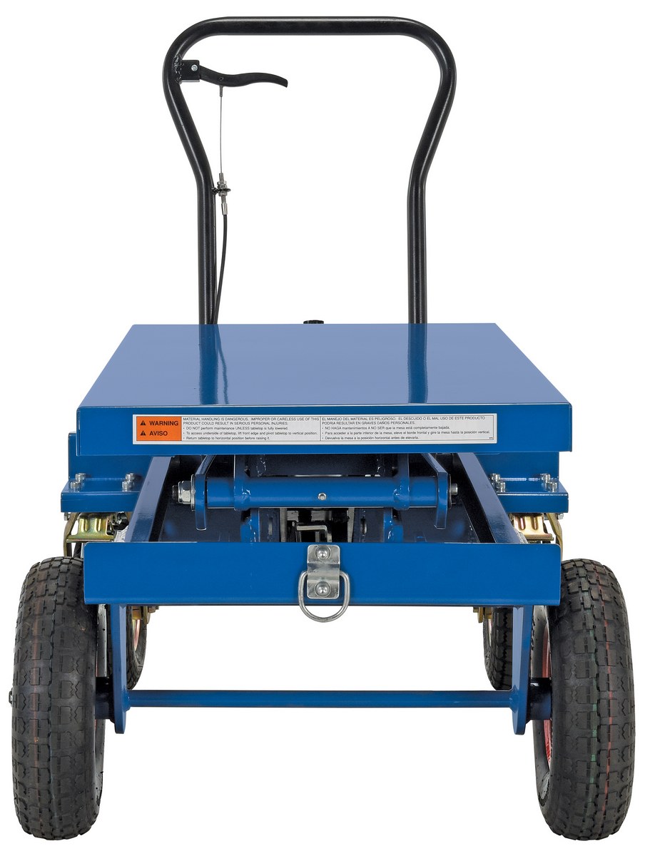Steel Rough Terrain Elevating Cart 20-1/2 In. x 40 In. 600 Lb. Capacity BlueThe Pneumatic tire Hydraulic elevating carts are designed to be ergonomically friendly for use in landscaping and construction sites. The unit is constructed of powder coated welded steel for long lasting durability, while moving smoothly on pneumatic tires over the roughest of conditions. The cart can be elevated or lowered with the foot actuated pump and can be held in place while in use with the additional safety stops.