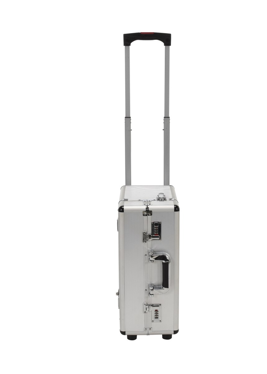 Aluminum Frame Case with Trolley 19 In. x 10 In. x 14 In. SilverThe Aluminum pilot case is designed for portability and dependability. The unit is constructed with MDF (medium-density fiberboard) panels and an ABS surface layer. Features include an aluminum frame construction, reinforced rounded corners, heavy-duty hinges, a telescopic plastic pilot handle, and wheels for easy transporting.