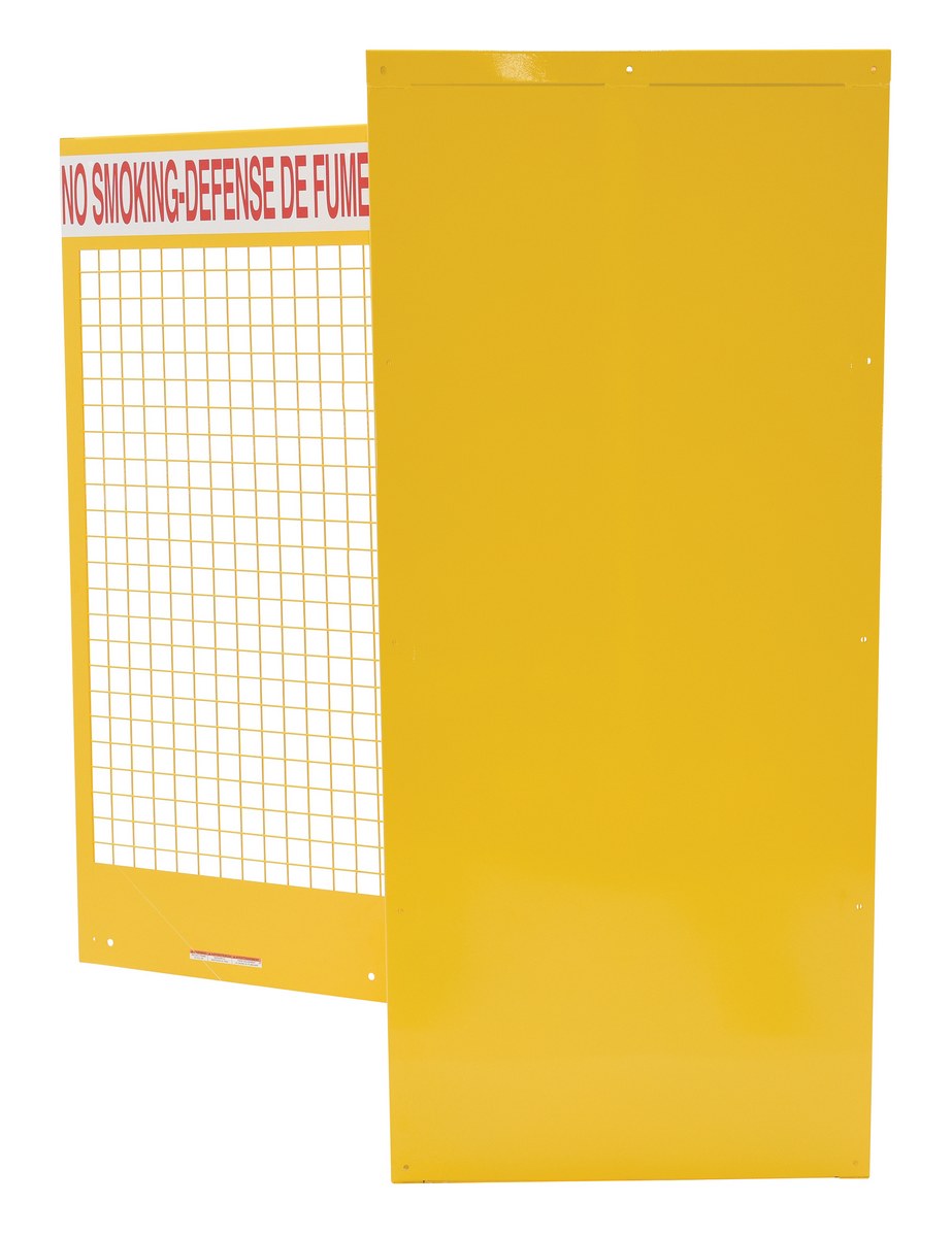 Durable steel cabinet for storage of other gas style cylinders. Cylinder storage capacity is based on cylinder size. Sides and door are made of expanded steel mesh. Bottom, back and top are made of solid sheet steel. Lockable doors protect cylinders (padlock not included). Base includes lag holes for securing unit to floor (hardware is not included). Includes red lettered sign age noting "no smoking" message in English and French. Rugged welded steel construction with safety yellow finish.