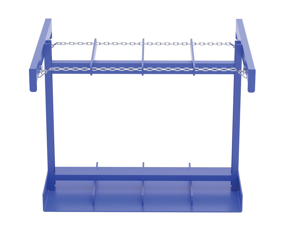 A Cylinder caddy transports cylinders safely with this fork mounted style. This unit comes complete with safety chains to secure the cylinders in place. The optional caster kit allows for portability without the need of a fork truck or pallet truck.