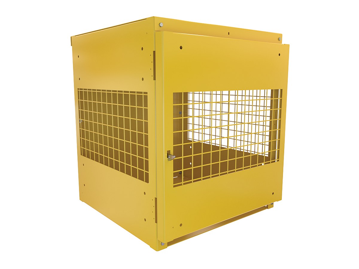 Steel cabinets for storage of cylinders. Cylinder storage capacity is based on cylinder size. Sides and door are made of expanded steel, and the bottom, back, and top are mode of solid sheet steel. Lockable doors protect cylinders (padlock not included). Base includes lag holes for securing cabinets. Chains for securing cylinders are included. Meets OSHA sec. 1910.110 (f )(6)(ii), ANSI NFPA 55 + 58, and CGA P-1 design standards. Rugged steel construction with safety yellow baked-in powder-coated toughness. This cabinet is shipped knock down and requires user assembly.