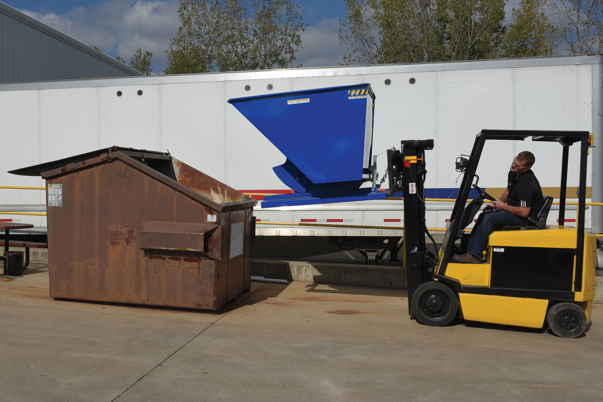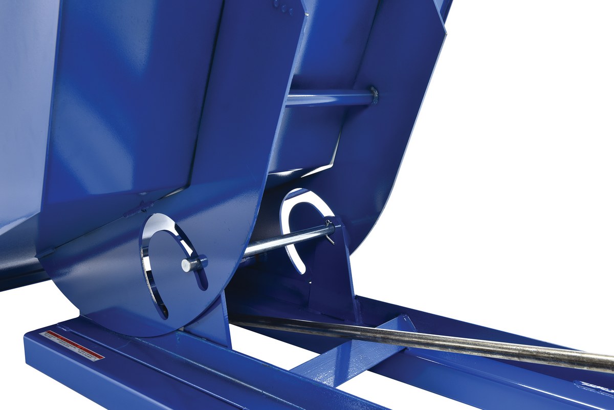This Heavy Duty self-dumping steel Hopper with bumper release automatically dumps when bumper release contacts the front of the dumpster. Hopper returns to an upright and locked position automatically after it dumps. Also includes a cable that may be operated from the seat of the fork truck to manually dump the hopper. The included safety restraint should be properly secured to a fork truck before dumping. (Length dimension is measured at top of chute.) Hopper is stackable if you stack the top hopper turned ninety (90) degrees from the bottom. Self-dumping hoppers facilitate compliance with OSHA general industry rule 29 CFR 1910.178(m)(5)(iii) by allowing lift truck operators to remain at the controls of their truck throughout the dumping process.