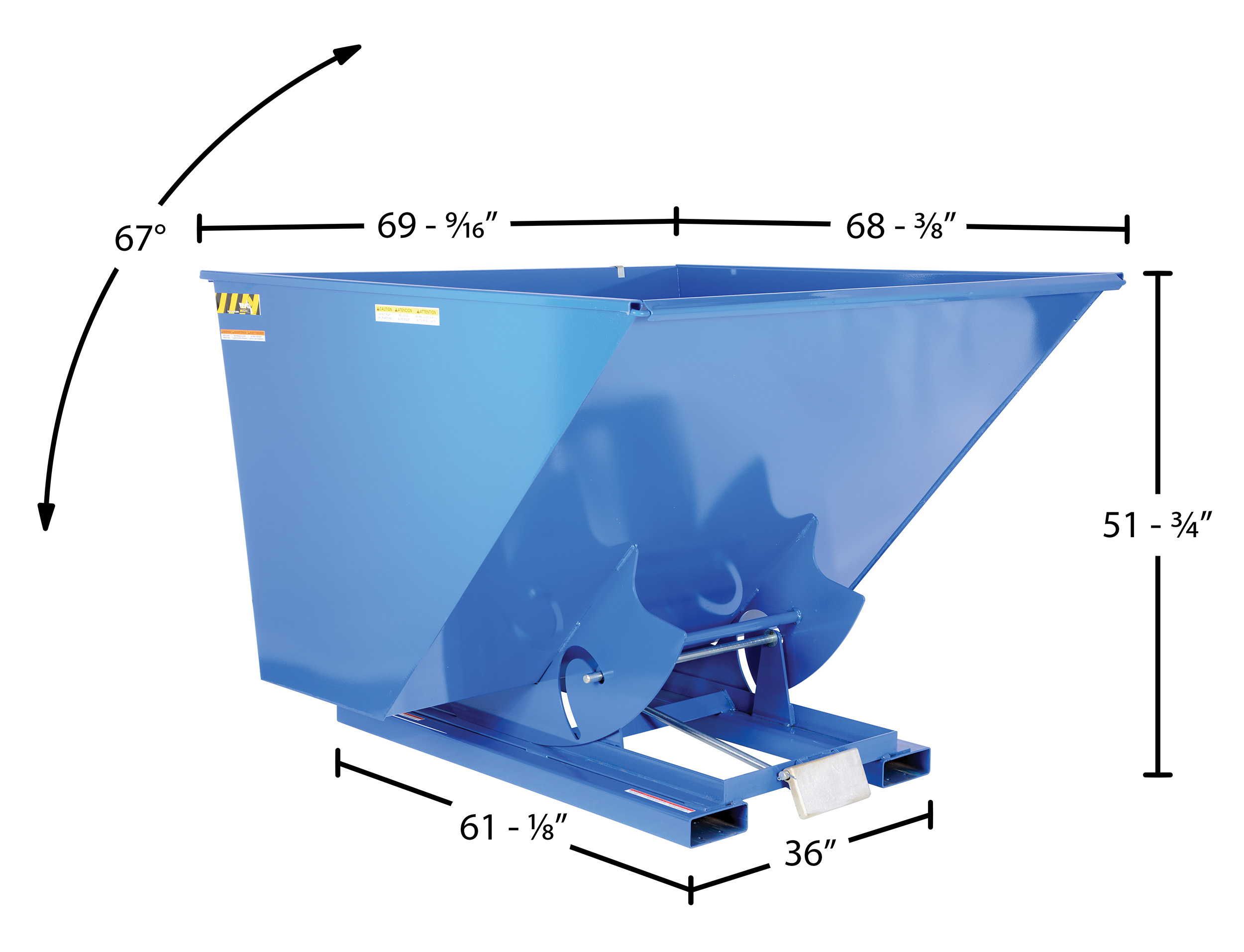 Steel Light Duty Self Dumping Hopper 2-1/2 Cubic Yard 2000 Lb. Capacity BlueThis Light Duty self-dumping steel Hopper with bumper release automatically dumps when bumper release contacts the front of the dumpster. Hopper returns to an upright and locked position automatically after it dumps. Also includes a cable that may be operated from the seat of the fork truck to manually dump the hopper. The included safety restraint should be properly secured to a fork truck before dumping. (Length dimension is measured at top of chute.) Self-dumping hoppers facilitate compliance with OSHA general industry rule 29 CFR 1910.178(m)(5)(iii) by allowing lift truck operators to remain at the controls of their truck throughout the dumping process.