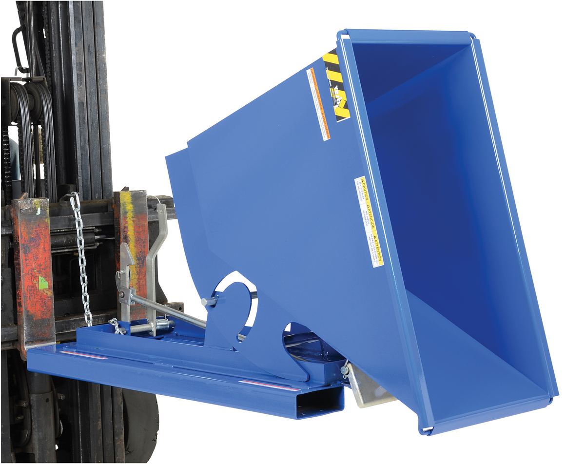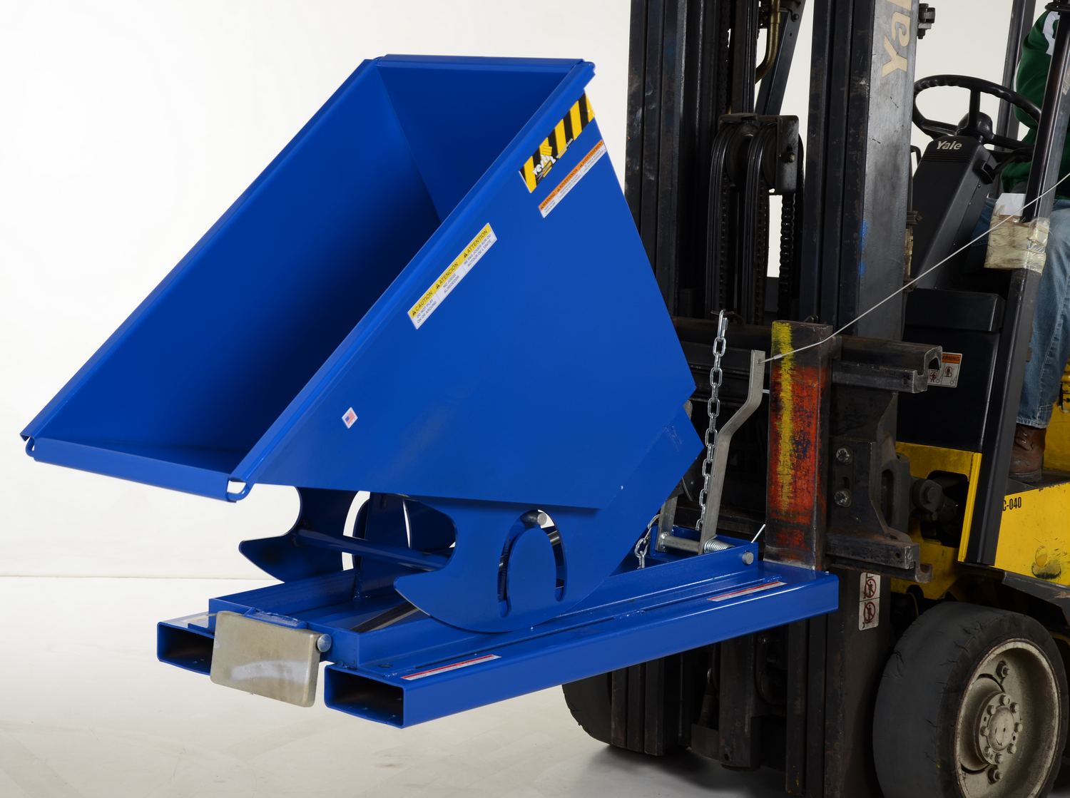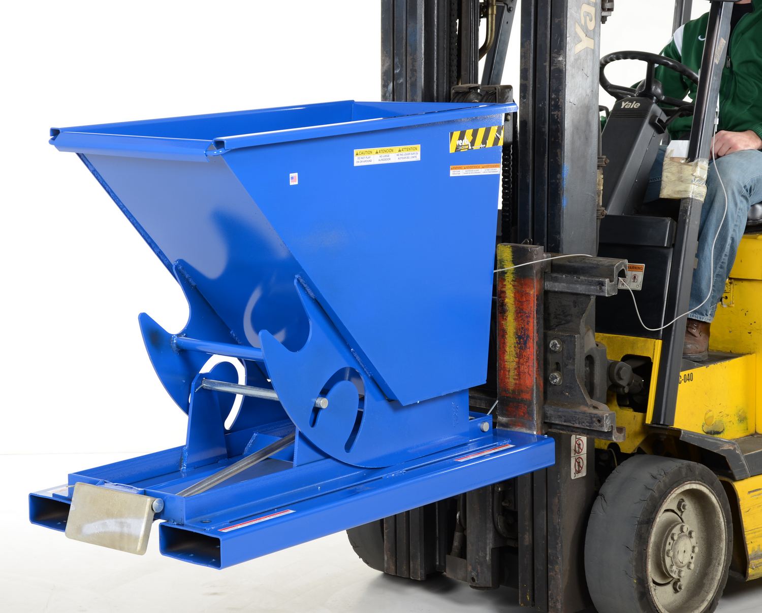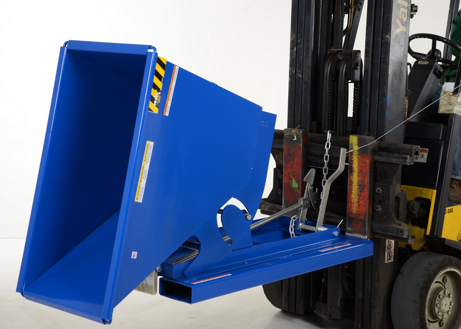 This Heavy Duty self-dumping steel Hopper with bumper release automatically dumps when bumper release contacts the front of the dumpster. Hopper returns to an upright and locked position automatically after it dumps. Also includes a cable that may be operated from the seat of the fork truck to manually dump the hopper. The included safety restraint should be properly secured to a fork truck before dumping. (Length dimension is measured at top of chute.) Hopper is stackable if you stack the top hopper turned ninety (90) degrees from the bottom. Self-dumping hoppers facilitate compliance with OSHA general industry rule 29 CFR 1910.178(m)(5)(iii) by allowing lift truck operators to remain at the controls of their truck throughout the dumping process.