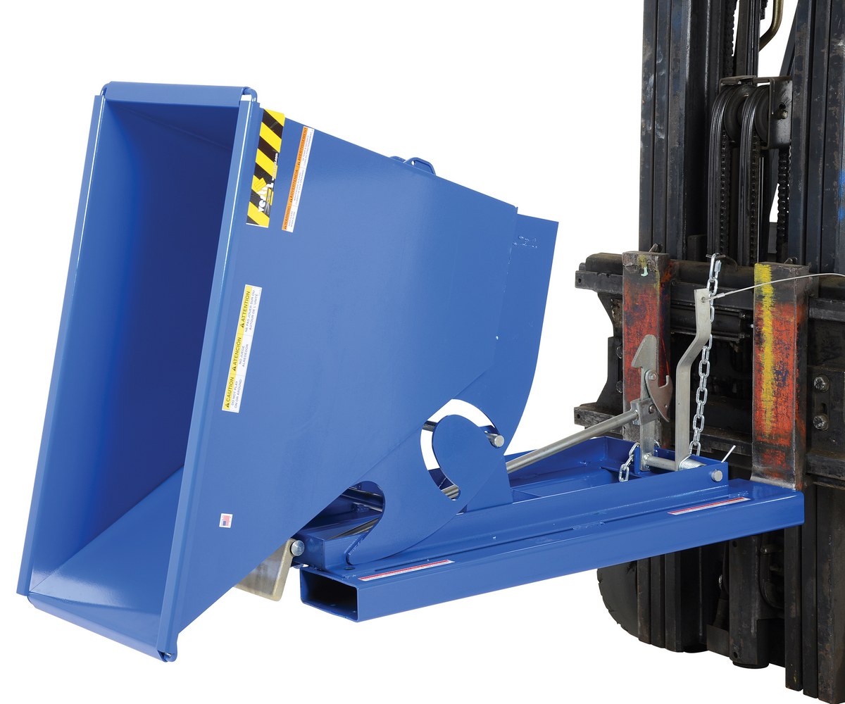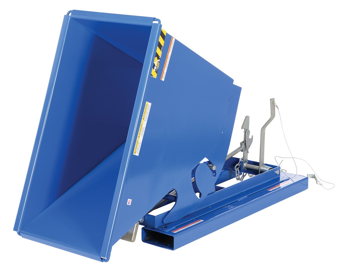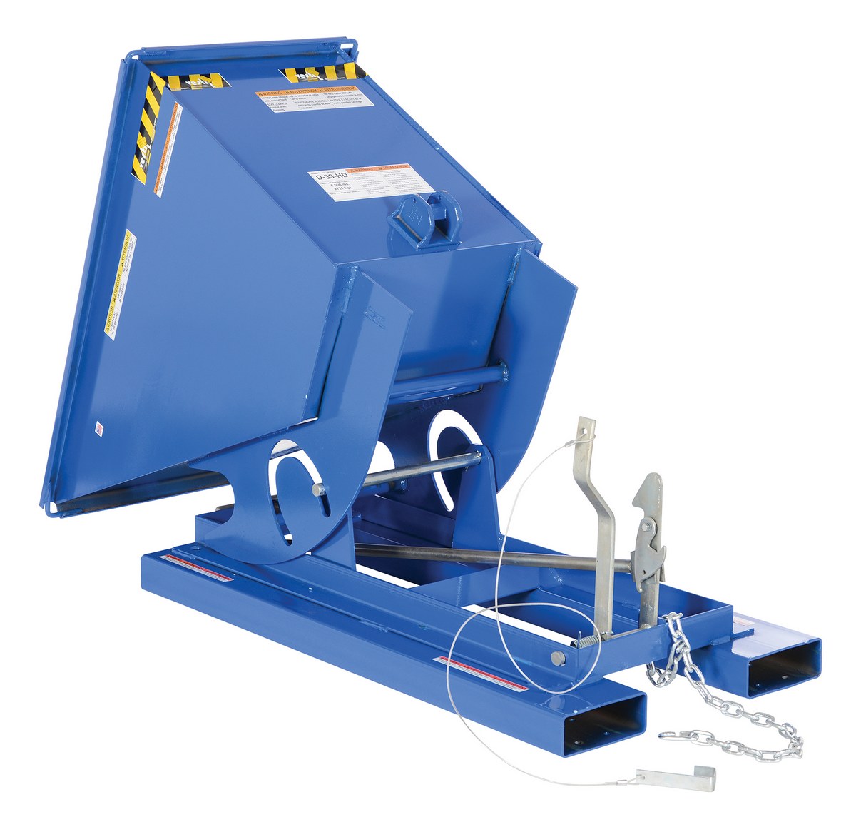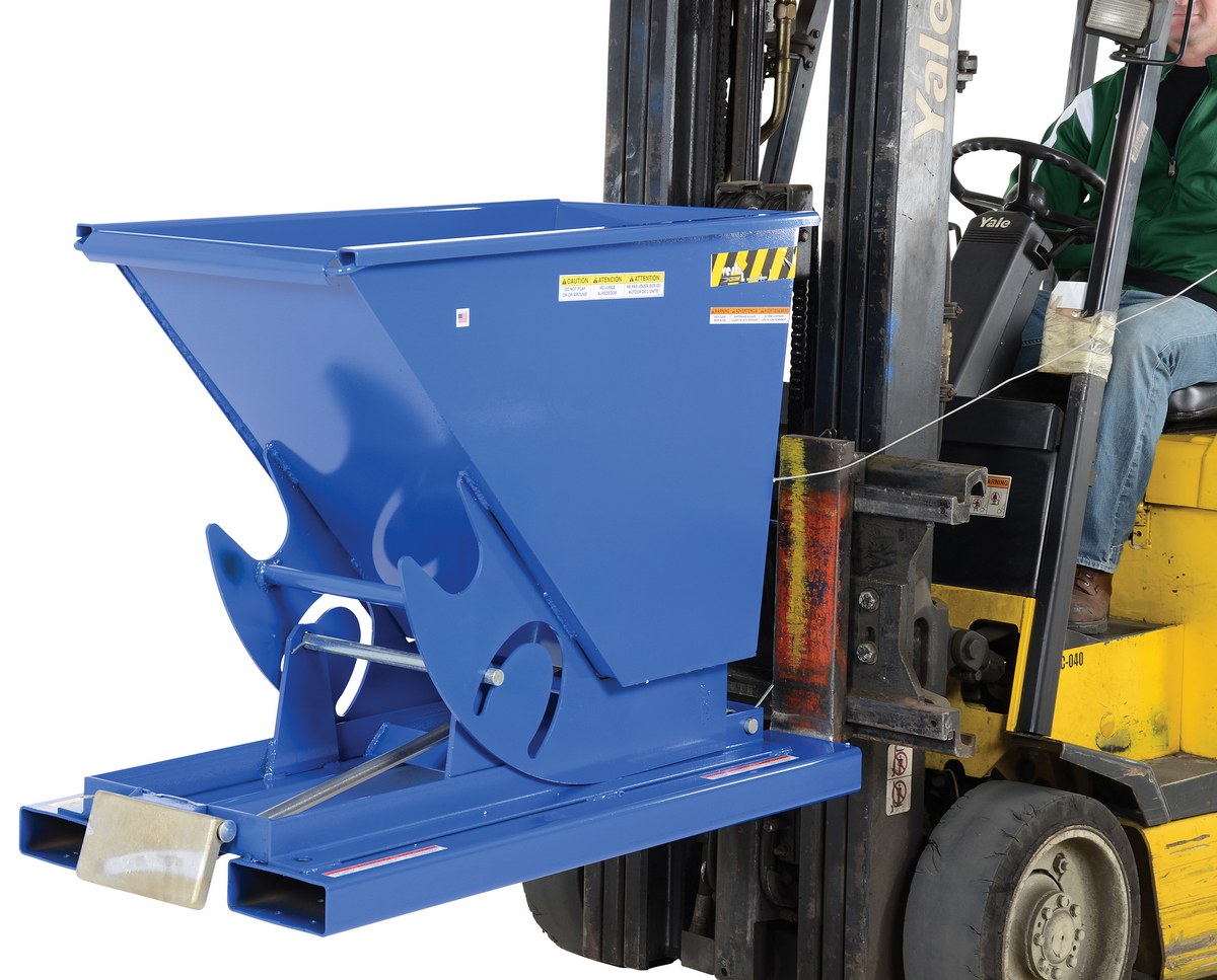 This Heavy Duty self-dumping steel Hopper with bumper release automatically dumps when bumper release contacts the front of the dumpster. Hopper returns to an upright and locked position automatically after it dumps. Also includes a cable that may be operated from the seat of the fork truck to manually dump the hopper. The included safety restraint should be properly secured to a fork truck before dumping. (Length dimension is measured at top of chute.) Hopper is stackable if you stack the top hopper turned ninety (90) degrees from the bottom. Self-dumping hoppers facilitate compliance with OSHA general industry rule 29 CFR 1910.178(m)(5)(iii) by allowing lift truck operators to remain at the controls of their truck throughout the dumping process.