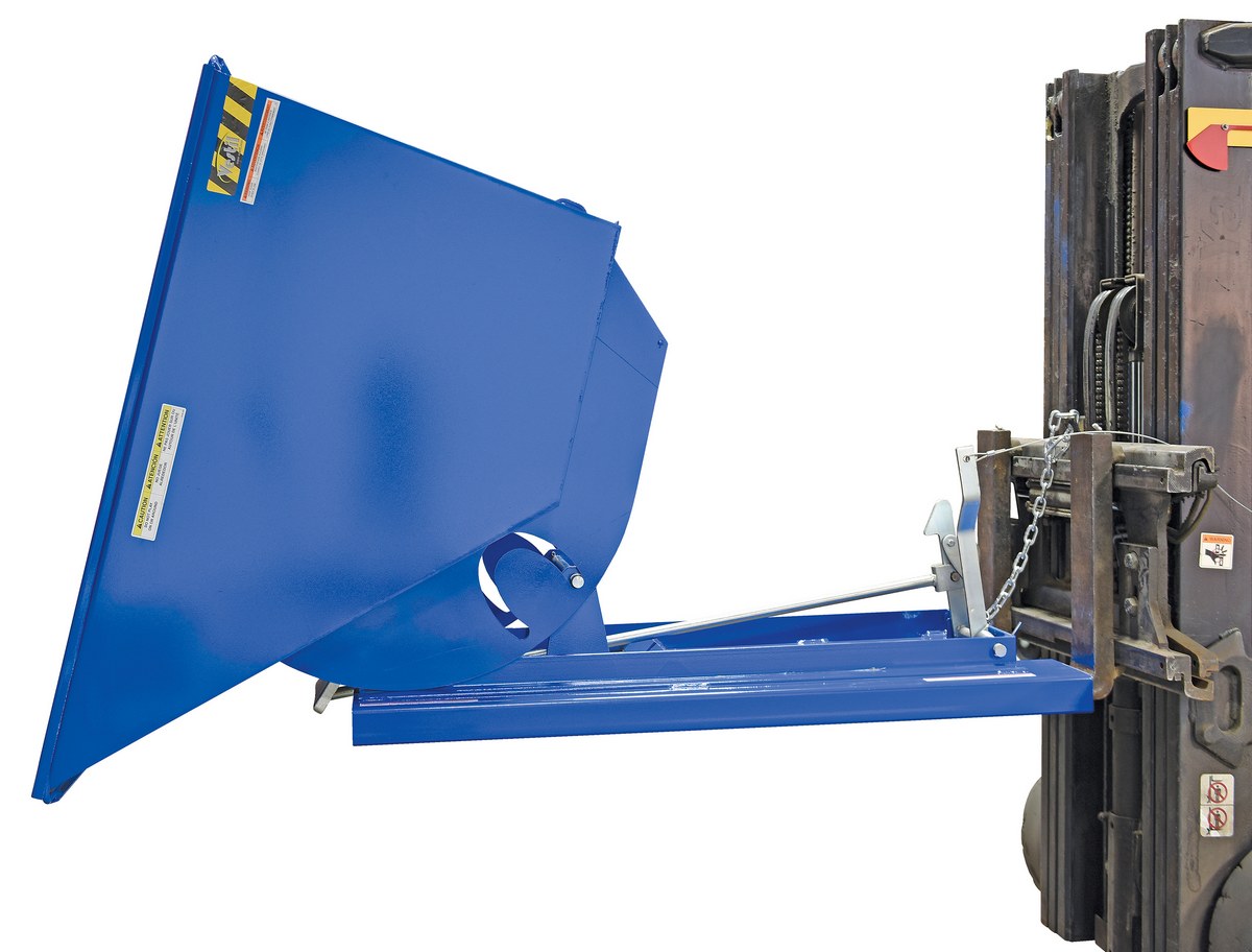 This Medium Duty self-dumping steel Hopper with bumper release automatically dumps when bumper release contacts the front of the dumpster. Hopper returns to an upright and locked position automatically after it dumps. Also includes a cable that may be operated from the seat of the fork truck to manually dump the hopper. The included safety restraint should be properly secured to a fork truck before dumping. (Length dimension is measured at top of chute.) Hopper is stackable if you stack the top hopper turned ninety (90) degrees from the bottom. Self-dumping hoppers facilitate compliance with OSHA general industry rule 29 CFR 1910.178(m)(5)(iii) by allowing lift truck operators to remain at the controls of their truck throughout the dumping process.