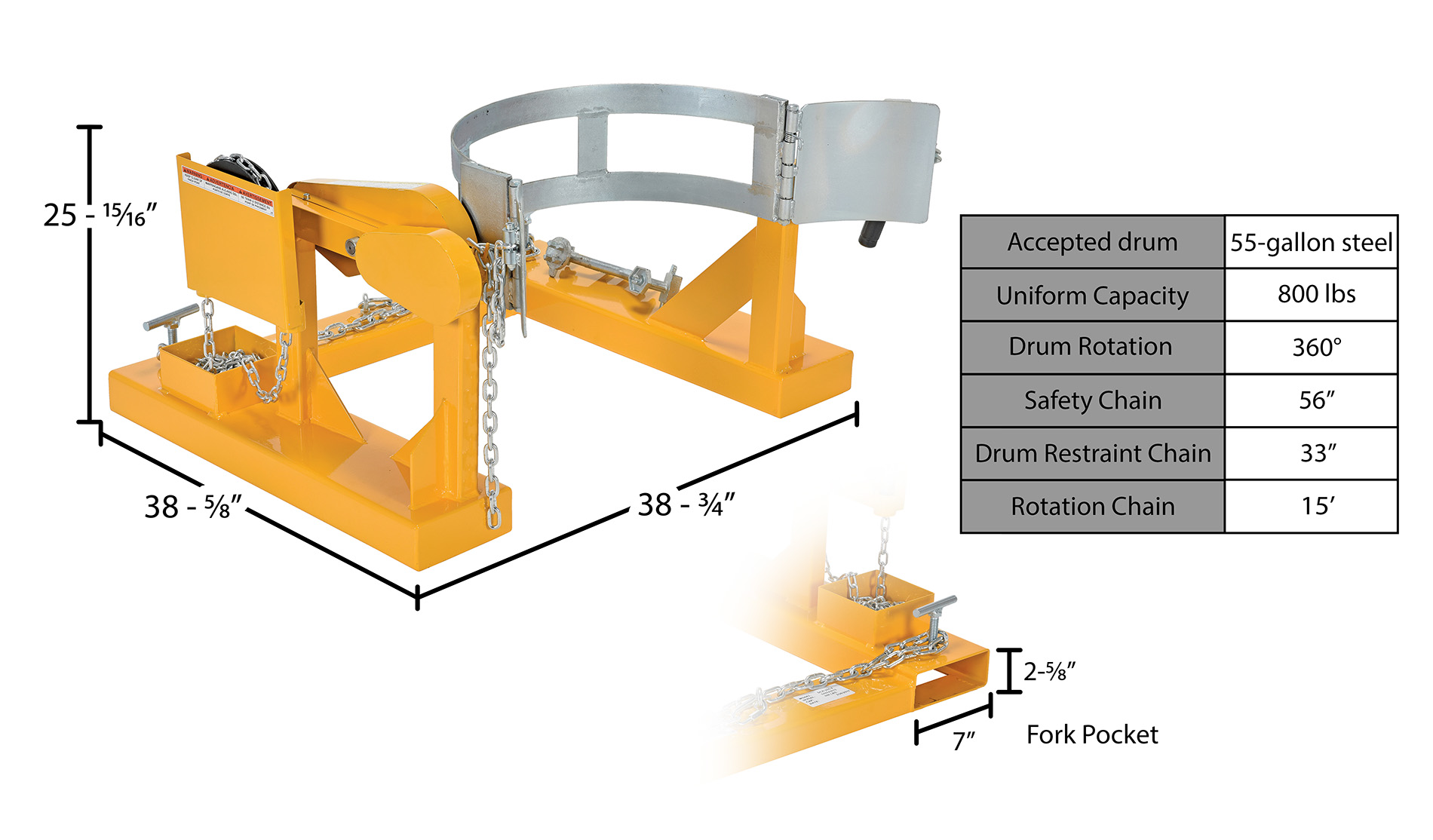 Uniform Capacity (lb.): 800 Accepts: 55-gallon steel drum Rotation Chain (ft.): 15