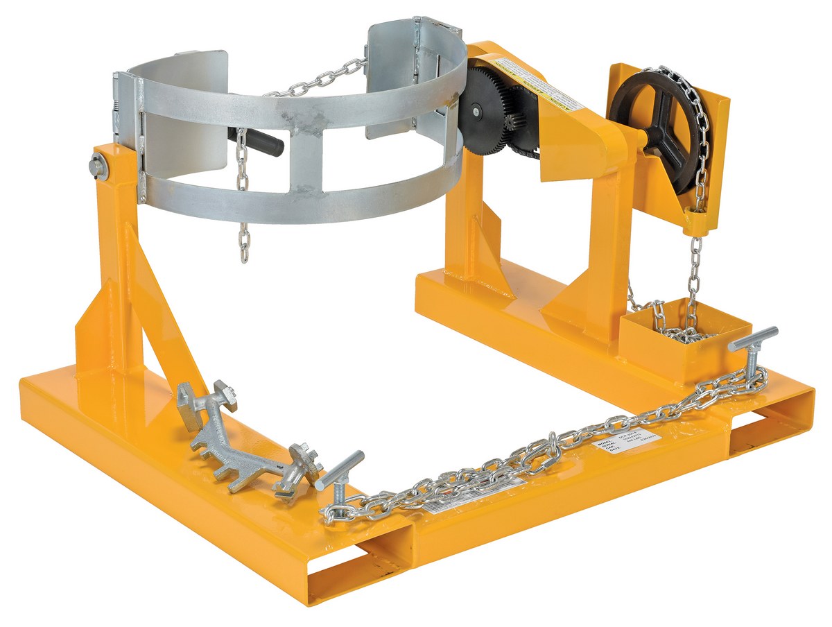 This Fork Truck drum carrier/rotator allows you to easily transport and rotate steel drums using a fork truck. Drums are held securely in place by a durable chain locking system. Carrier/rotator is provided with a chain to allow the drum to be rotated from the fork truck operator's seat. Drum must be full to rotate at rated capacity. Complies with OSHA Gen. Industry rule 1910.178; ANSI B56.1.