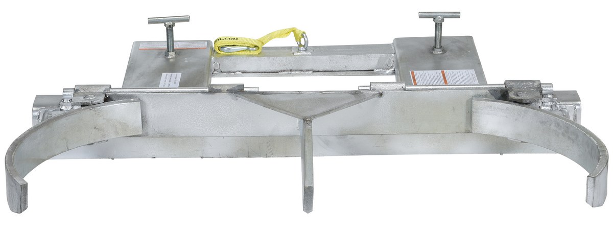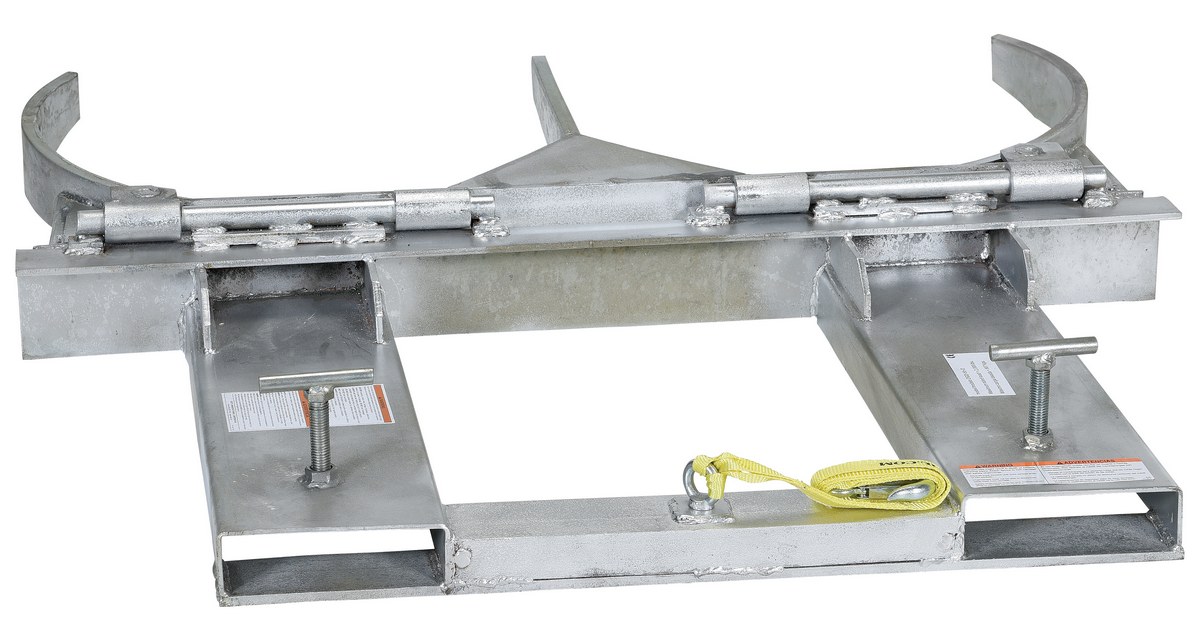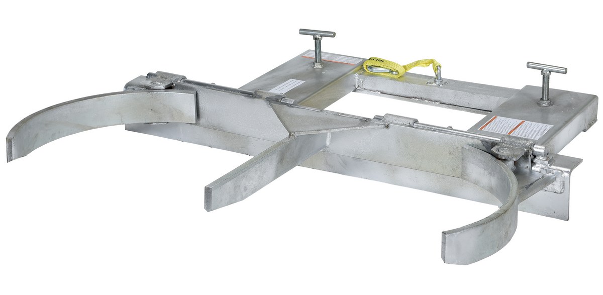 The drum grippers make it easy to pick up one or two open head (with lid installed and secured) and closed head steel drums without leaving the seat of the fork truck. Simply slip the forks into the fork tubes, fasten the safety restraint and the drum gripper is ready to go. The knuckle gripping system is lowered around the drum, gripped tightly, and then lifted into the air. Drum is automatically released by lowering the forks. All models feature hinged folding design for storage.