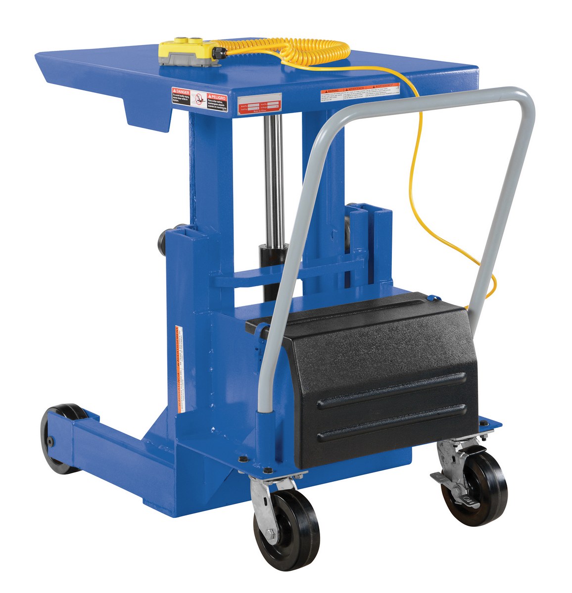 Steel DC Ergonomic Manual Die Table 24 In. x 30 In. Chrome Platform 2000 Lb. Capacity BlueDesigned to reduce back injuries and cumulative trauma disorders. Lifts heavy equipment to ergonomic working height. All welded steel construction will provide years of service and hard work. Small frame size allows unit to access hard-to-reach locations. Two (2) rigid and two (2) swivel with side brake casters standard.