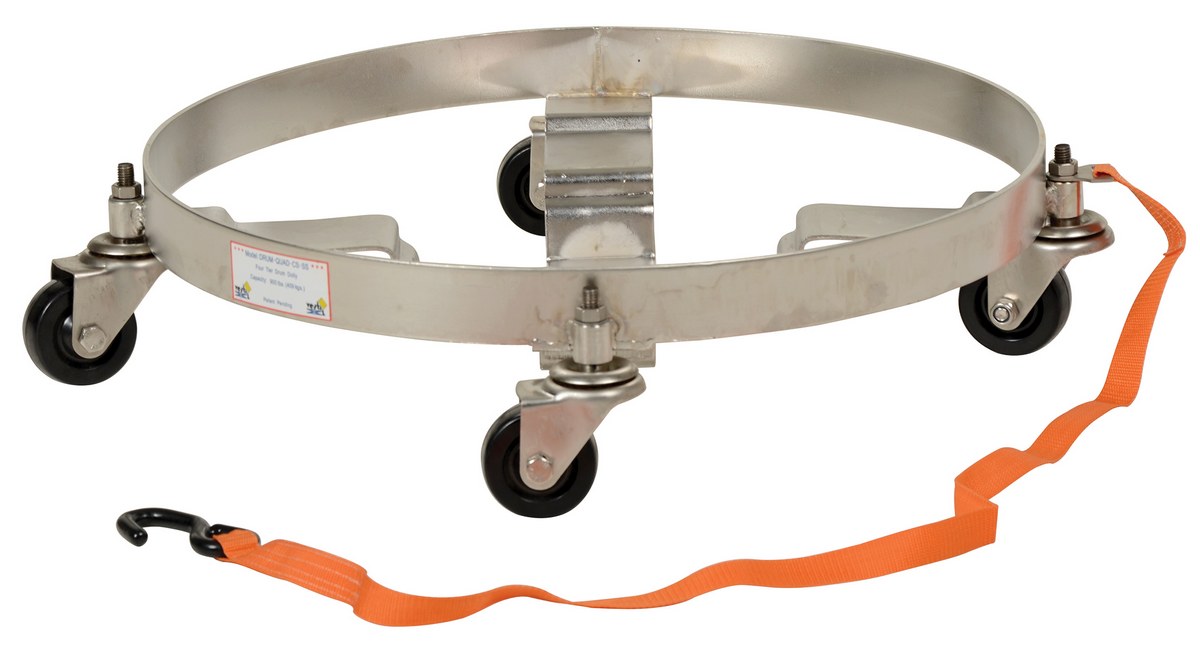 This multi-purpose quad drum dolly is stainless steel. (No carbon steel components.) The dolly comes with a nylon pull strap that helps in transporting down aisles or over thresholds. Rubber-coated hook allows strap to hook on top of drum for storage.