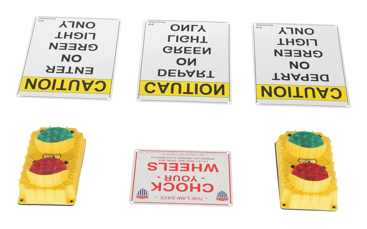Our dock traffic systems feature flashing red and green lights. Prevent accidents and injuries by providing clear communication between dock personnel and truck drivers. Built-in eyebrow type sun visors increase light visibility. Economy, model DTS-5, comes with two (2) yellow polypropylene traffic lights, 6."W x 11."H, each having a green and a red lens. The light containing a push button is placed inside the dock area for the dock attendant, and the other is placed outside for the truck driver. Four (4) signs are included. LED model never needs bulb replacements.