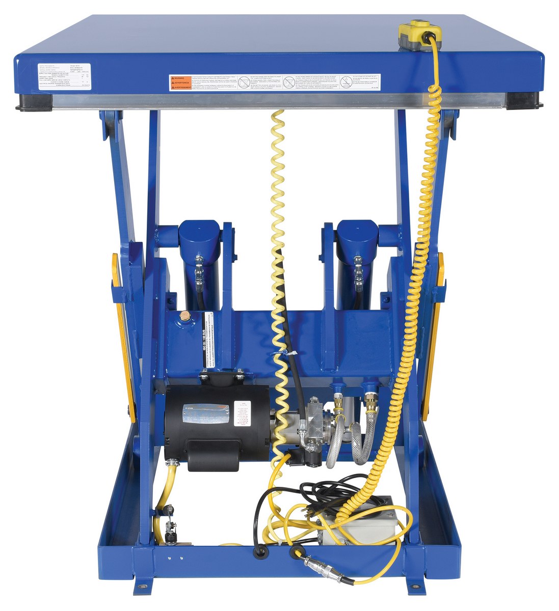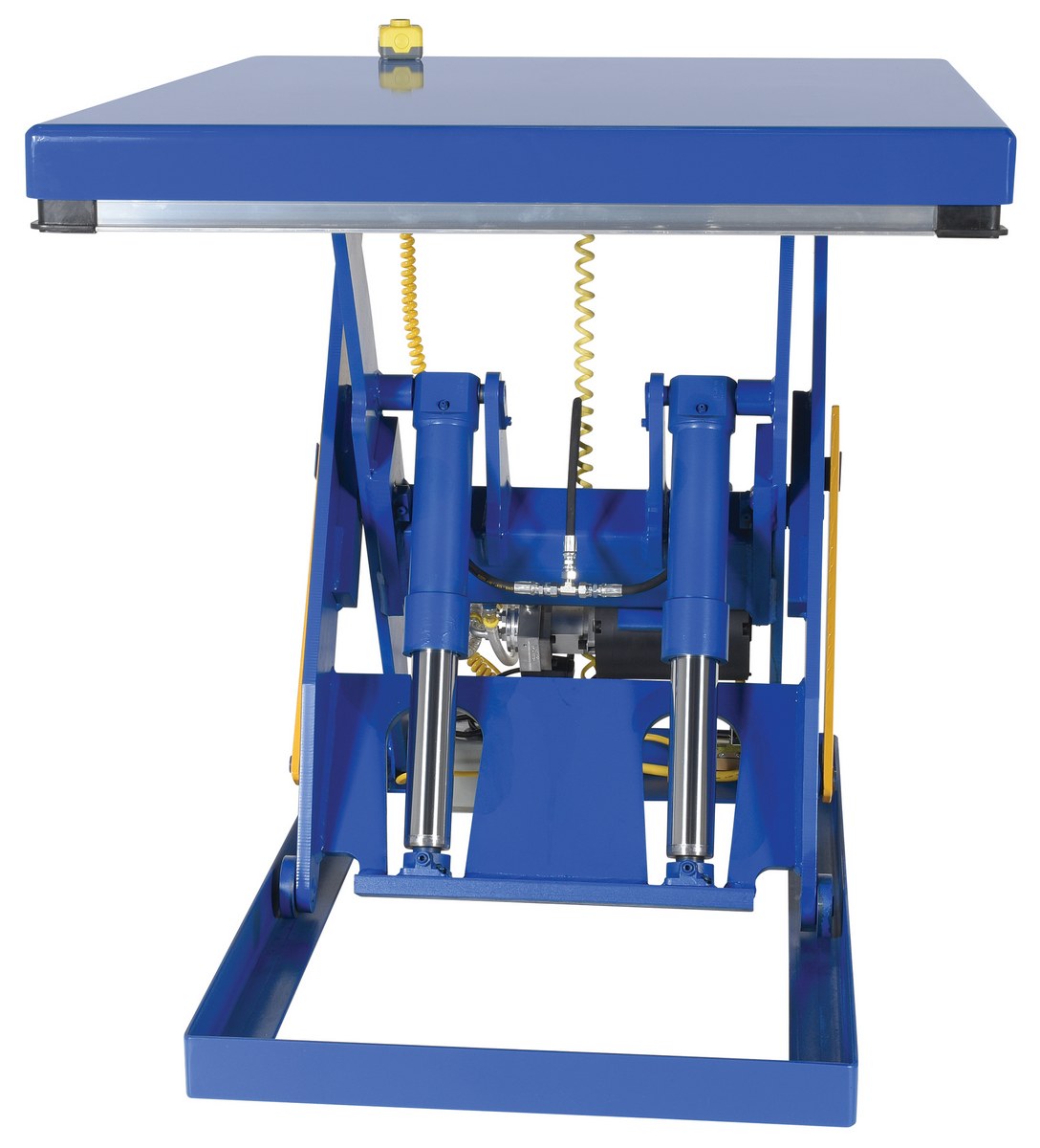 The electric hydraulic scissor lift table is used by all types of manufacturing and warehouse facilities. Safety features include a patented pinch point perimeter toe guard to protect pinch points while lowering the table, fused push button control, internal safety velocity fuse to maintain platform height in the event of hose or fitting failure, integral maintenance prop, adjustable upper travel limit switch to stop the table at maximum height, and displacement-style hydraulic cylinders for maximum strength. It also features a pressure plated pump, manifold system, and state-of-the-art lifetime lubricated bearings. The standard 56 frame electric motor is fully enclosed with additional voltage options available. Contact factory if platform dimensions are crucial.