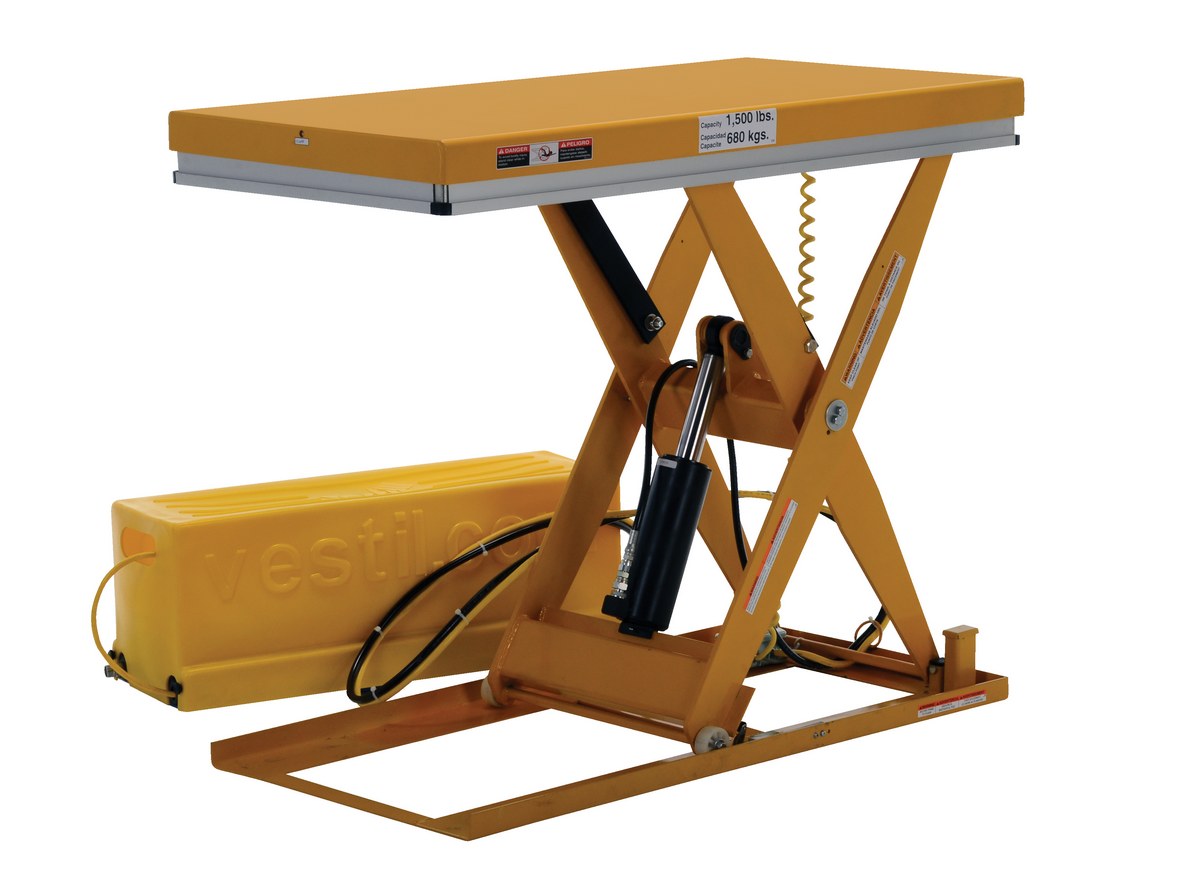 Steel Work Station Electric Hydraulic Scissor Table 24 In. x 48 In. 1500 Lb. Capacity YellowThe work station electric hydraulic scissor table is designed to raise products up to an ergonomic working height. It maximizes safety with minimum space requirements and is ideal for all types of manufacturing and warehouse facilities. The external power unit can be located eight (8) feet away from the unit and comes with a standard hand control. An electric toe guard also comes standard with the unit.