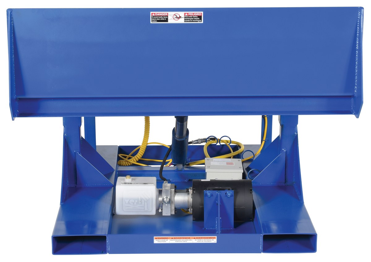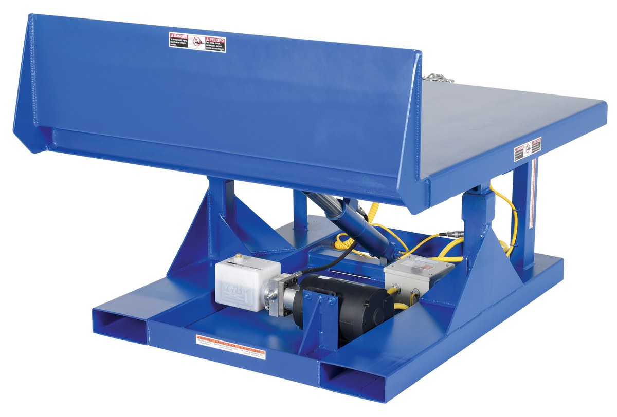 Steel Efficiency Master Tilt Table 48 In. x 48 In. 2000 Lb. Capacity BlueThe efficiency master tilt table tilts pallets, crates, boxes, or baskets to facilitate easy container loading or unloading. The table features all welded steel construction for years of durability. The unique design minimizes pinch points to meet OSHA requirements. This tilt table is equipped with an industrial quality motor that delivers the best torque with minimal amperage draw for maximum life. Standard voltage is 460/3PH, with additional voltage options available. The tilt table has a standard push button hand control. Base includes fork pockets for portability with forklift.