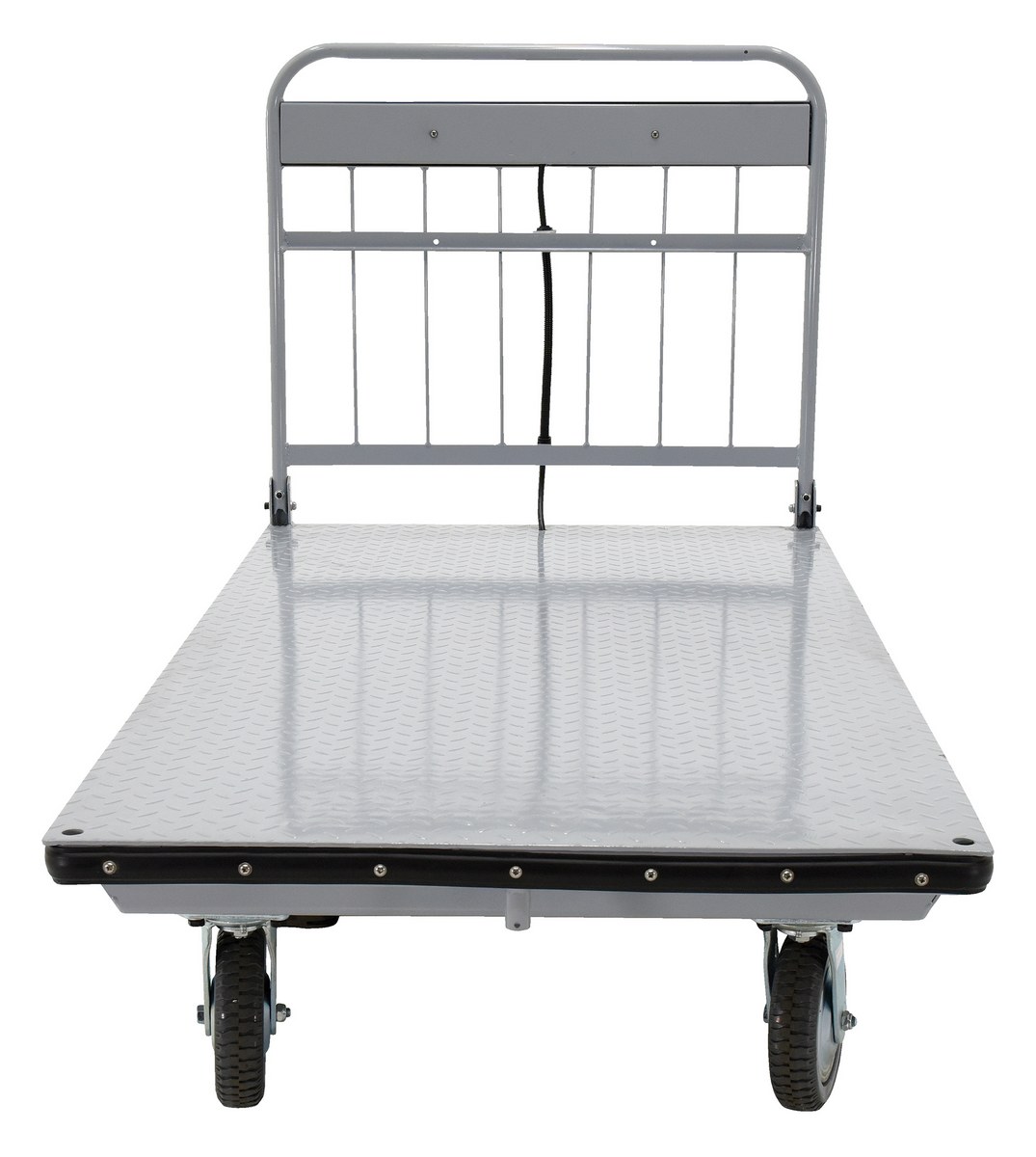Steel Electric Material Handling Cart No Sides 36 In. x 72 In. 2000 Lb. Capacity GrayElectric material handling carts are ideal for moving heavy loads safely and easily throughout warehouses, offices, schools, and hospitals and incorporates a multitude of features to make light work of heavy loads. Reduce injury and increase productivity with these high quality carts. Features an 800W electric drive motor with (2) two 12V batteries for power and on-board 115V AC battery charger. The handle includes forward and reverse throttle control levers, an emergency reverse switch, a battery level gauge, and a slow/fast speed switch. Pinpoint turning is accurate with the mid-axle drive feature.