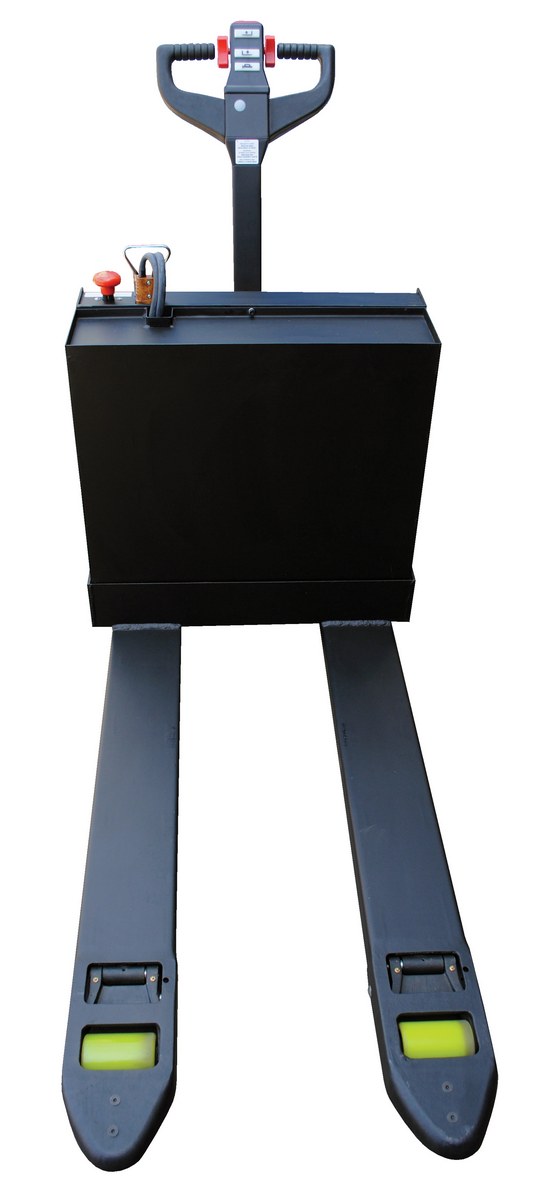 Steel Pallet Truck with Rider Platform 27 In. x 48 In. 4500 Lb. Capacity BlackThe fully powered electric pallet truck has an easy and quick operation. The unit raises and lowers loads with a push of a button. It can maneuver loads in warehouses and trailers. The reinforced welded forks have adjustable tie-rods that provide long service. The high-torque DC drive and lift motors handle heavy-duty jobs. Unit includes integral battery charger, battery level gauge, and emergency battery disconnect. The truck rolls smoothly on poly-on-steel, steer and load wheels. Ergonomic handle features easy to operate throttle with infinite adjustment of forward and reverse speeds, lift/lower controls, proprietary safety-enhancing emergency reverse function, and horn. When the proprietary safety-enhancing emergency reverse function is actuated, the emergency reverse belly switch instantly reverses direction and moves the unit forward (away from the operator) until the switch is released or after 1.5 seconds have elapsed. The built-in safety circuit will automatically disable the entire unit if the emergency reverse belly switch is activated for more than 1.5 seconds after which the unit must be re-set to return to normal operating conditions. This state-of-the-art safety device provides a high degree of operator protection. Includes an electromagnetic disc brake with automatic dead-man feature that activates when the user releases the handle. Also includes a stand-on platform, which flips up when not in use.