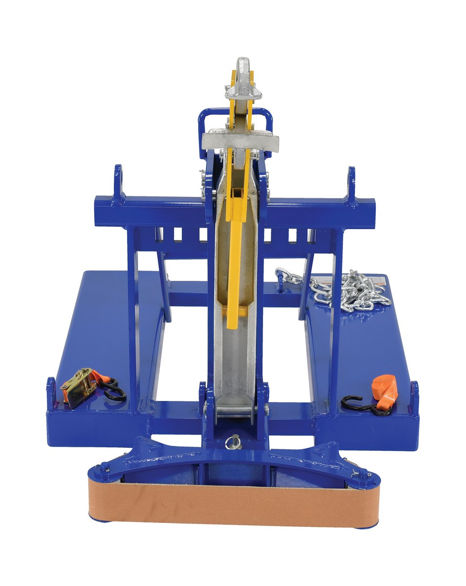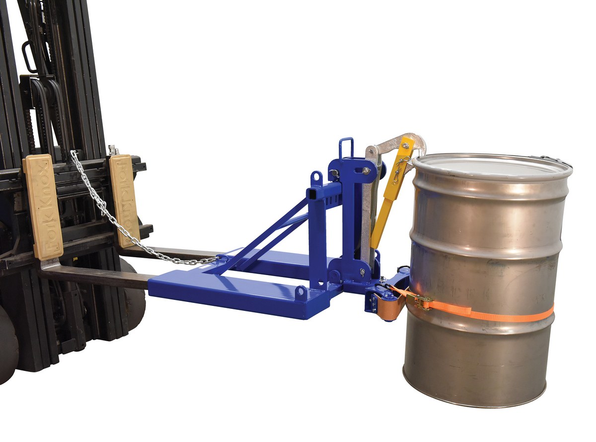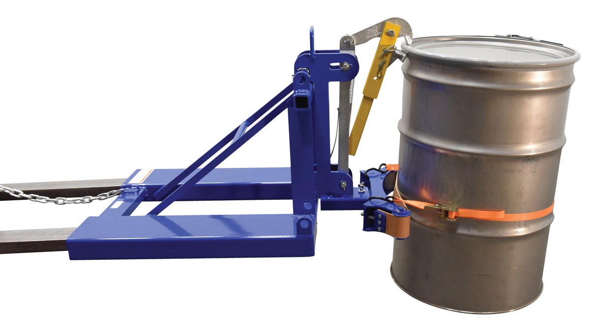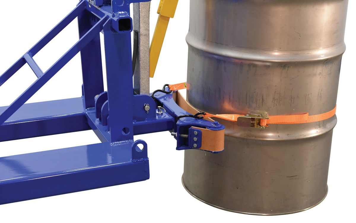 This time tested and proven design allows a fork truck operator to easily secure, move, and release drums without leaving the seat of the fork truck. For use with open (with lid installed and secured) and closed head steel, plastic, and fiber drums with a top lip strong enough to support the weight of the drum. Includes safety restraint to secure unit to the fork truck. Welded steel construction. Baked-in powder-coated toughness. A ratchet strap is supplied to secure the drum to the unit when traveling over rough terrain.