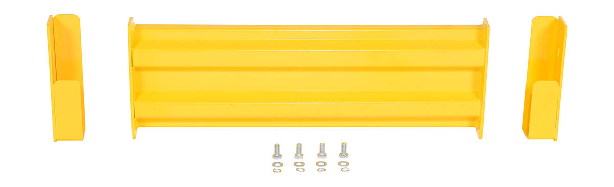 Steel 2 Ribbed Drop In Style Guard Rail 30 In Length YellowProtecting equipment, inventory, and most importantly individuals from damage or injury is always a concern. But, with a structurally strong steel guard rail those worries can be eased. This rail is double ribbed for impact resistance both indoors and out. With the drop-in style rail design, accessibility is simple and rails can be positioned quickly. To put in place simply slide the rail sections into the post saddles. Powder coated finish for built in added toughness. Additional posts are available and sold separately. If adding a rail to an existing rail and post section, only a single post is needed.