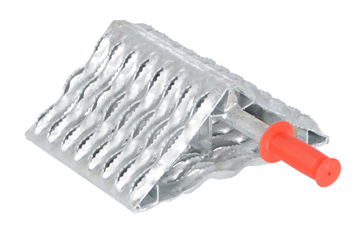 The steel Wheel Chock is made of serrated steel in a grate style. It has a galvanized finish and includes a positioning handle with grip.