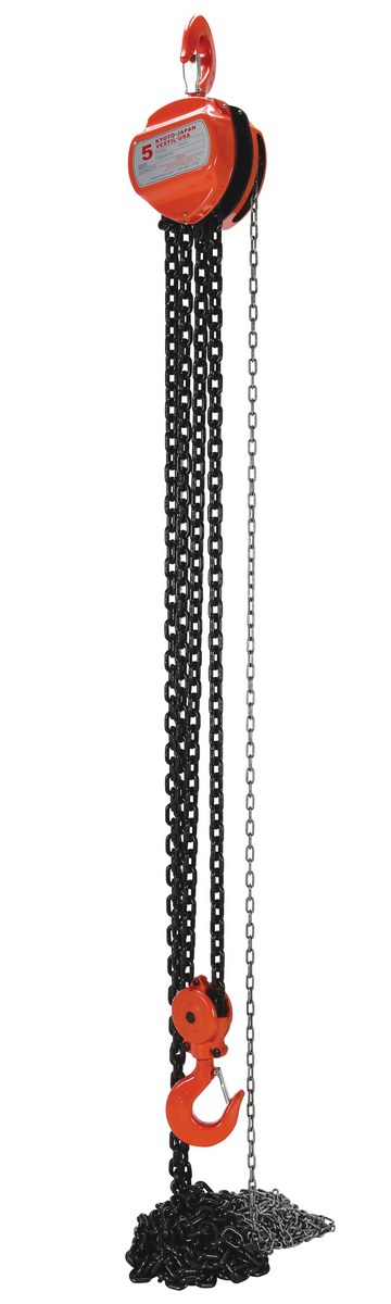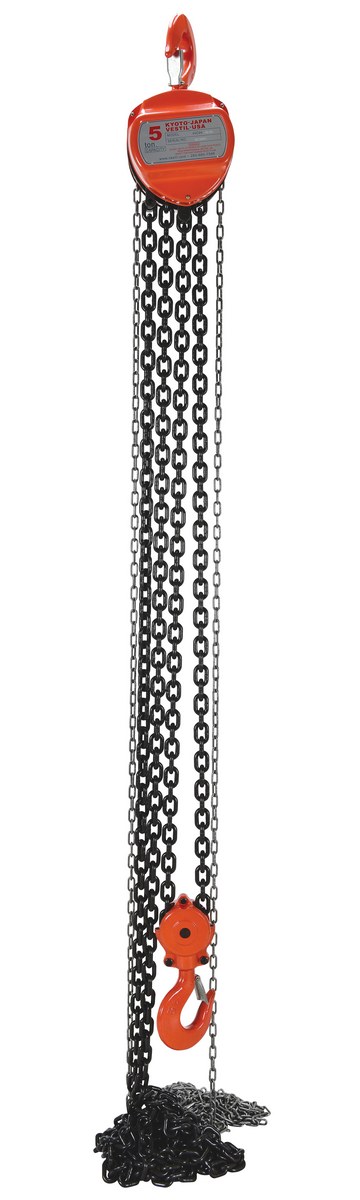 Steel Manual Chain Hoist 20 Ft. Lift 10,000 Lb. Capacity OrangeThe hand chain hoists are ideal for industrial applications. The hoist is light weight, ergonomically friendly to handle, and designed for comfortable use in low headroom /confined areas or work. Features include a pull chain with upper and lower hooks constructed of forged steel for additional strength and hardened two stage gears for a quicker pulling time.