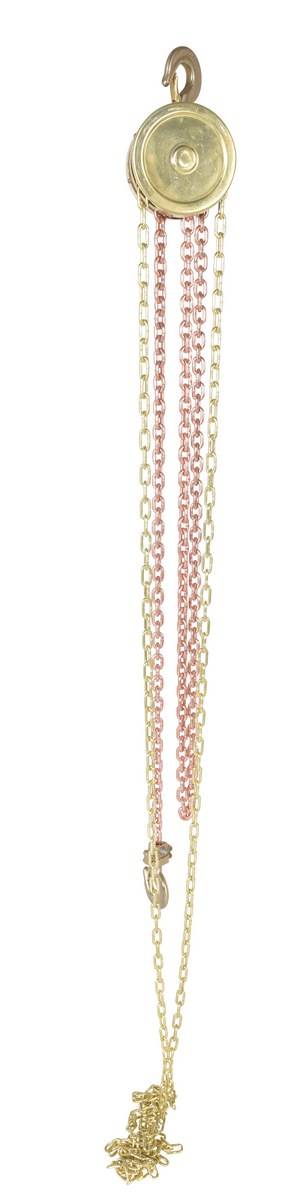 Non-sparking brass construction. Brake engages automatically as soon as the hand chain stops moving. Forged load hooks. Low gear ratio reduces effort required for lifting. Satisfies relevant ANSI B30.16-2003 requirements.