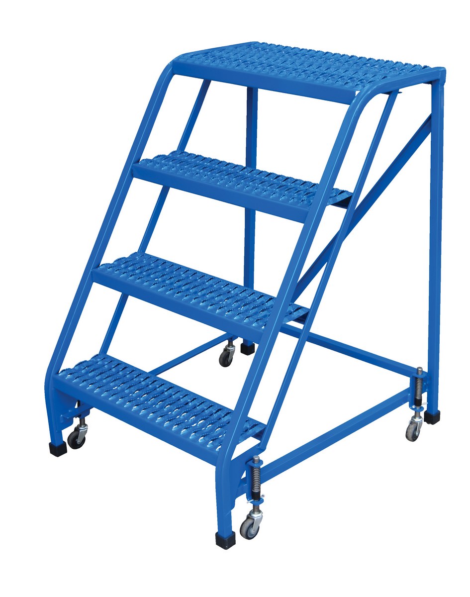 The standard slope ladder is a portable warehouse ladder for every-day use applications. Grip strut steps, no handrail and welded square tubular steel construction with powder-coat blue finish. Rubber feet provided for floor protection. Unit has (2) two all directional spring-loaded swivel casters and (2) swivel casters with total locks. Ships fully assembled and ready to use.