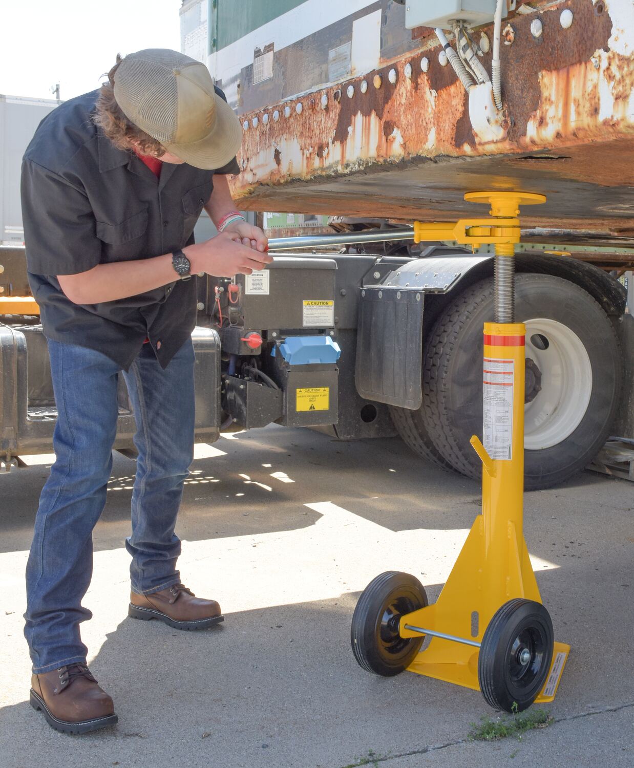 Trailer stabilizing jacks are used to prevent up-ending of semi-trailers when they are not connected to a tractor during loading and unloading operations. Throughout the loading and unloading process it is always recommended to use two jacks, one on each side of the front of the trailer. The trailer must be situated on a flat, stable and improved (preferably concrete) surface, while the jack sits perpendicular to the underside of the trailer. Every jack is built of a high strength steel construction with a flush-type Zerk fitting for lubricating ACME screw. A yellow powder coat finish and a reflective collar for visibility at night are both included. Each jack meets OSHA regulations when used with wheel chocks. **The color of handles included with models may vary between red and black**.