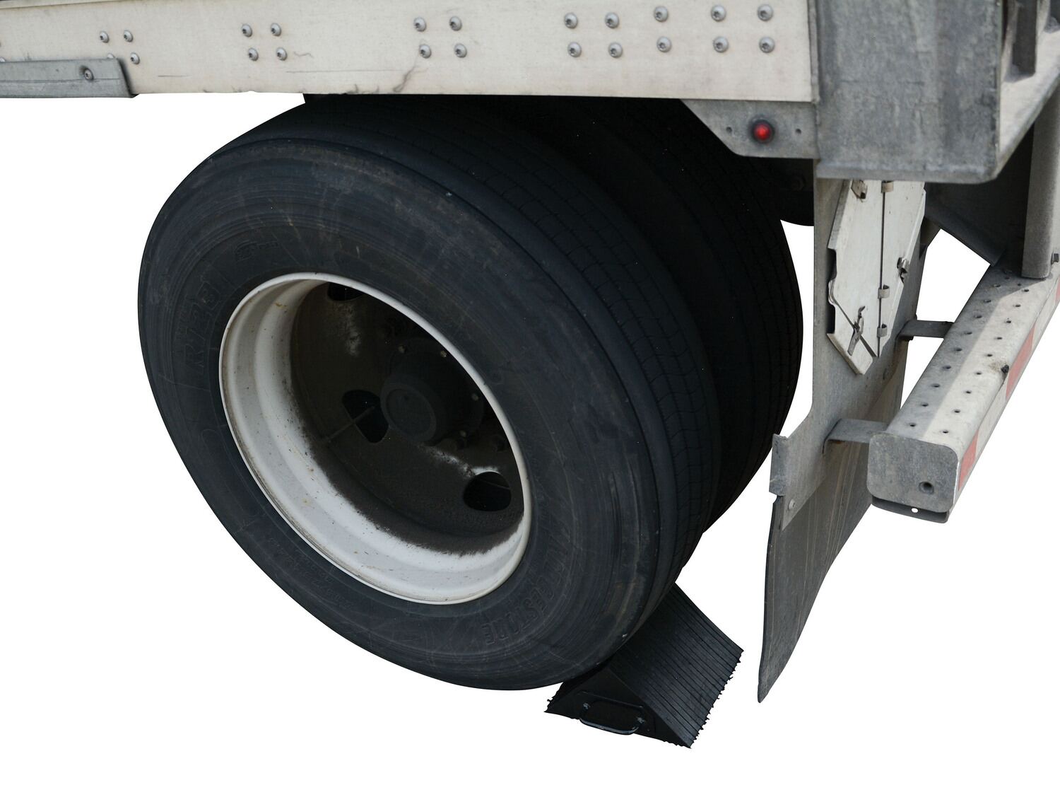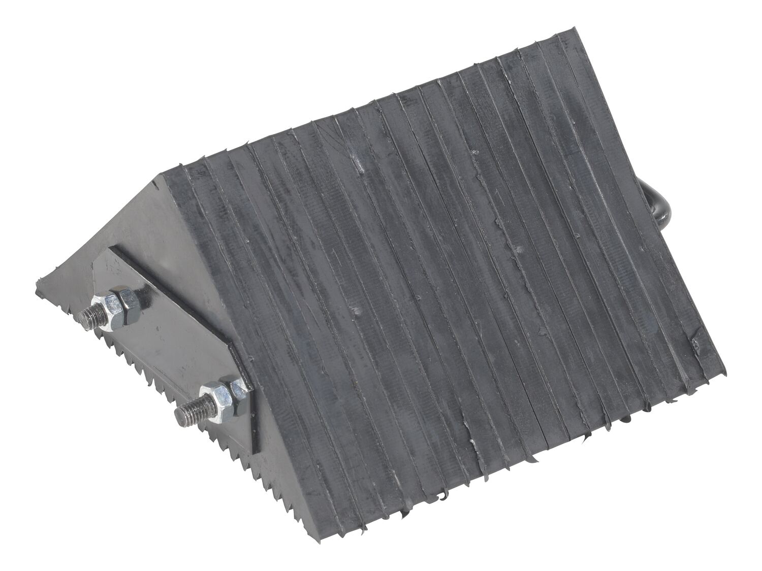 The rubber Wheel Chock is constructed of reinforced rubber to provide a sure grip on virtually any surface. The curved surface contours to fit tires. Rubber resists tearing, abrasion, ozone weathering, etc. The functional design is durable in all weather conditions.