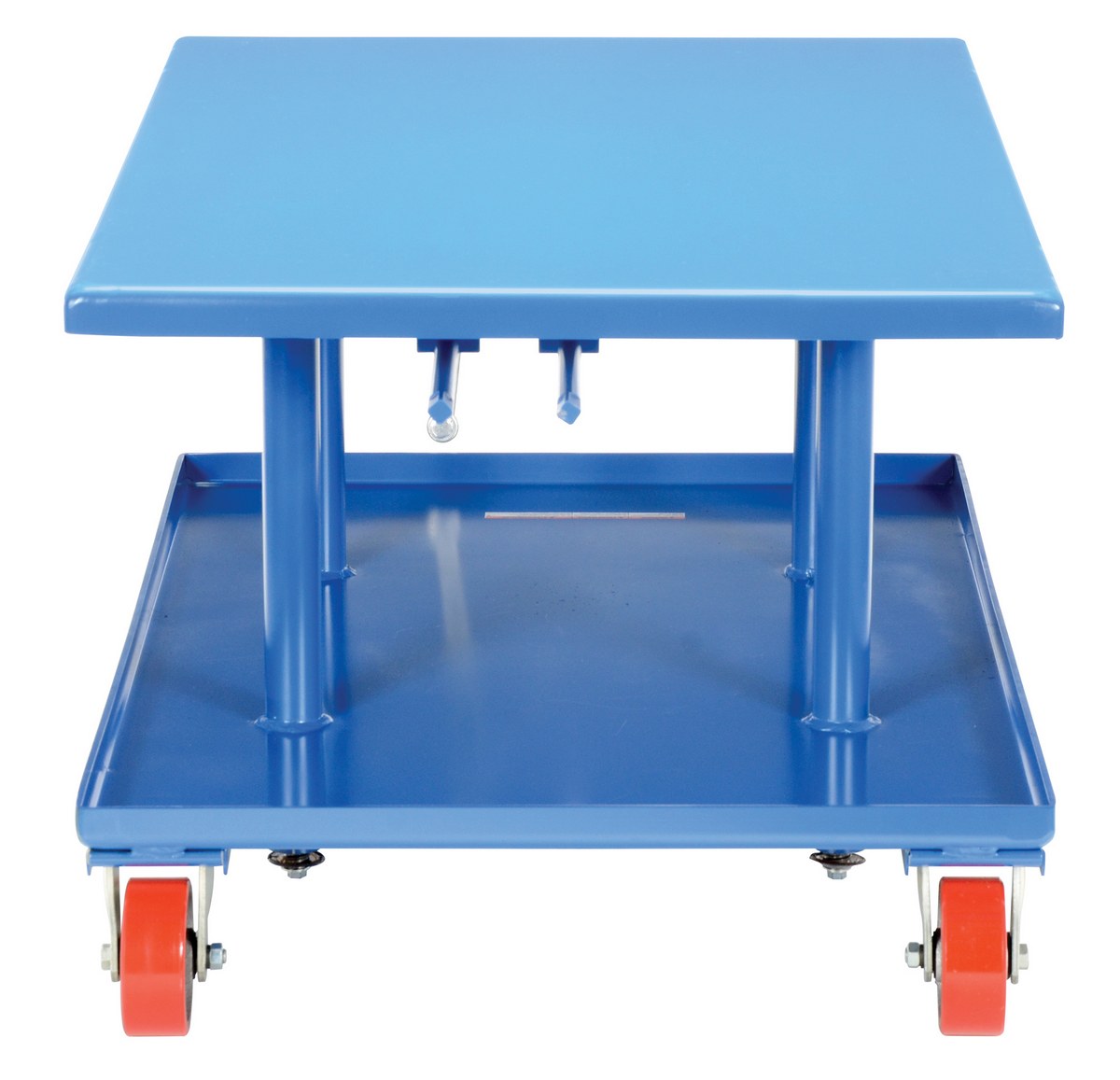 The mechanical post table is an adjustable portable table that is well suited for a wide variety of material handling applications. It moves smoothly on two rigid and two swivel poly-on-steel casters. Includes bolted on adjustable floor lock. Provides positive height adjustment without a downward shift. It features a two-speed manual gear mechanism to move heavy loads.