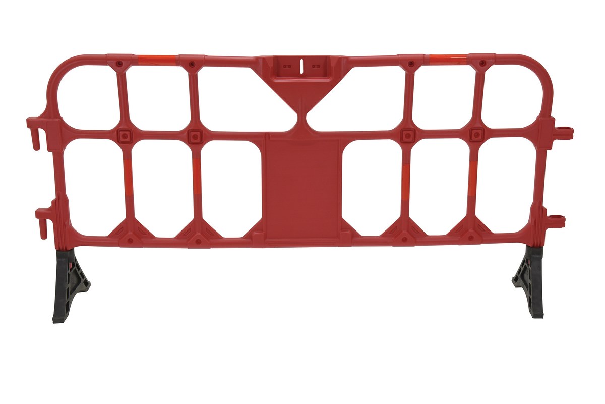 Plastic interlocking barriers will not rust and will retain attractive appearance. Reflective red tape provides better identification at night. Barrier ends include connectors for interlocking multiple units. The non-removable feet come pre-filled with sand for weight ballast. Feet can be rotated to allow for barriers to be stacked. Manufactured from hope material and includes UV stabilizer for longer life. Ships and stores assembled.
