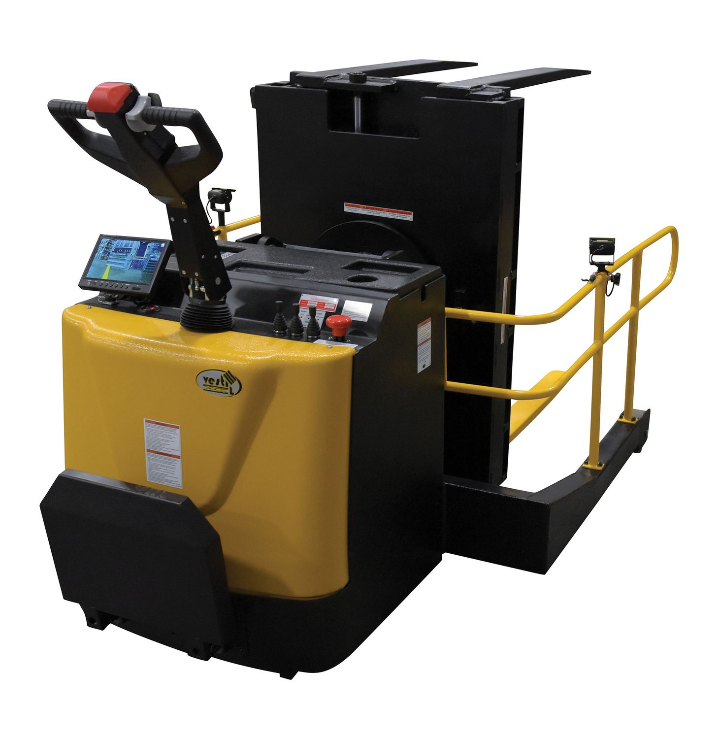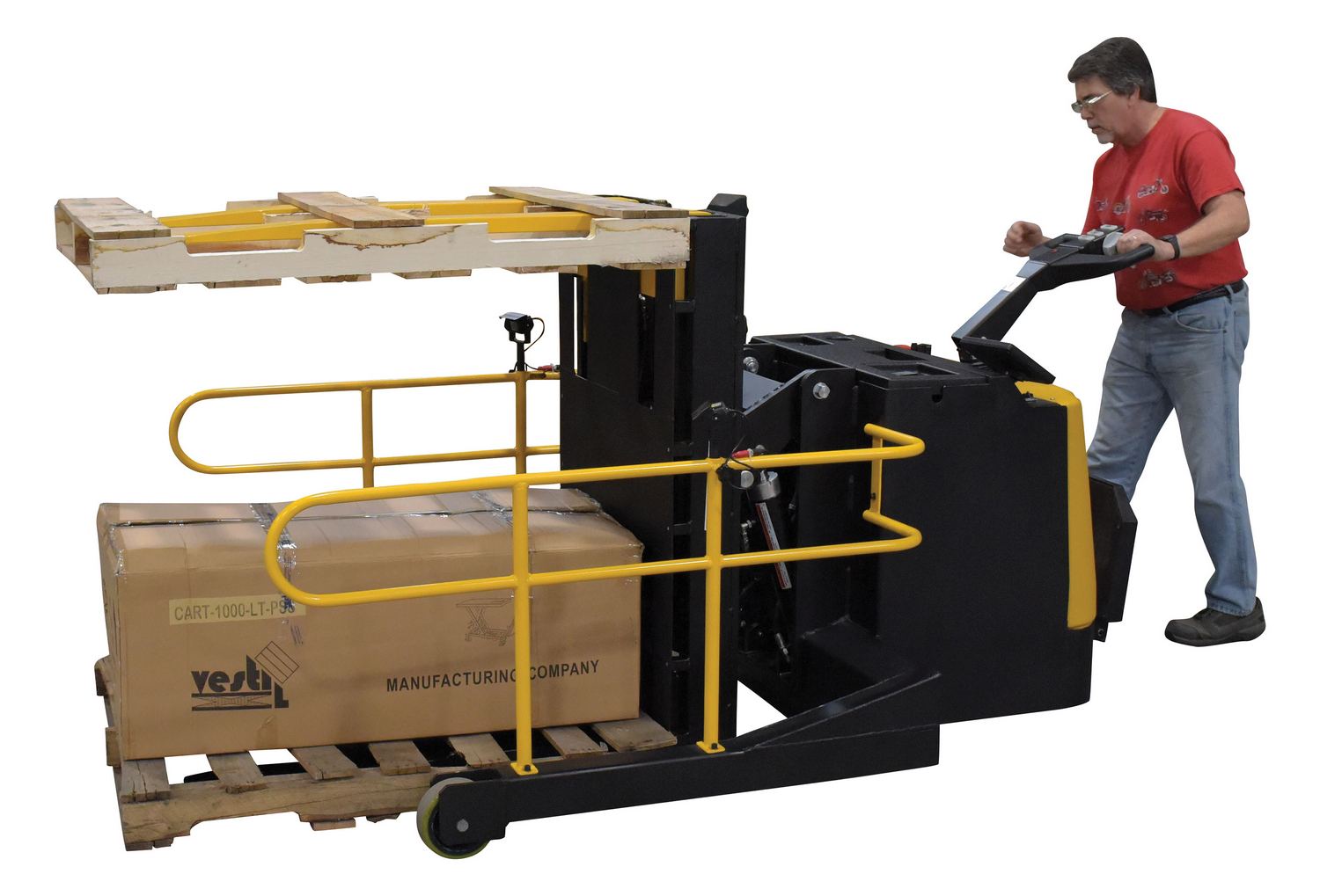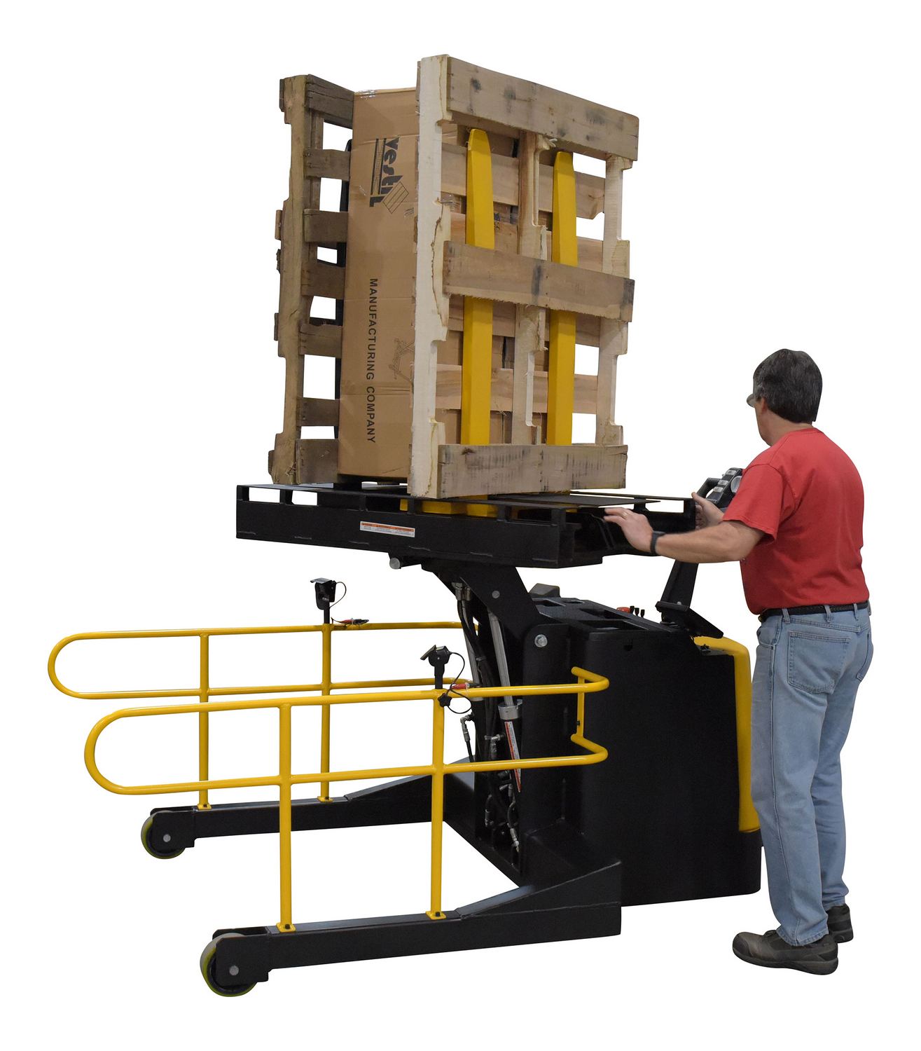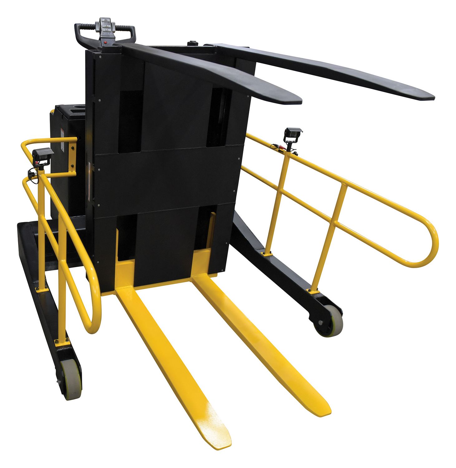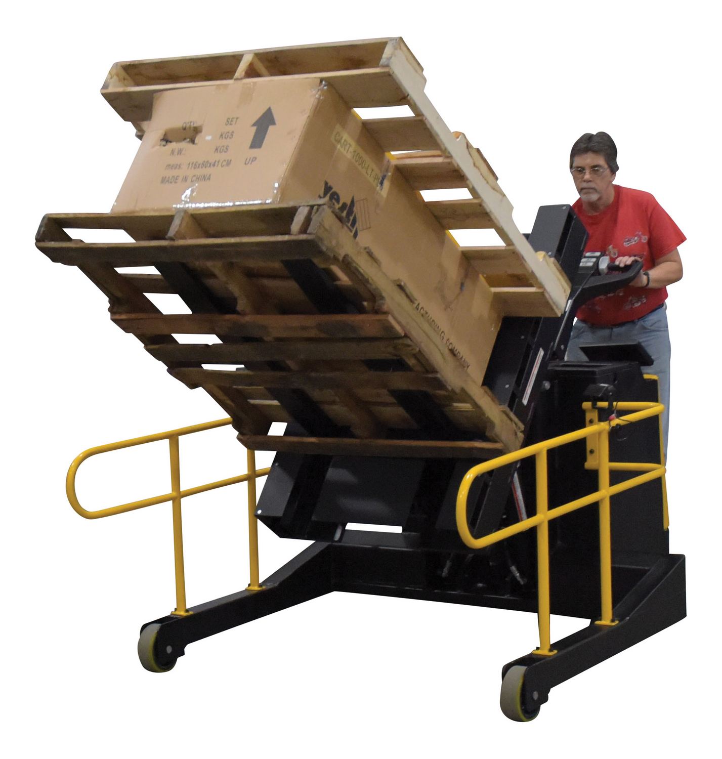 Tilt (powered) and rotate (manual) loads with our durable pallet inverter. Low profile design allows the operator to stand on the rider platform and steer the load from workstation to workstation quickly and easily. DC power lift and drive makes operation safe and efficient. The ergonomic handle features easy to operate throttle with infinite forward and reverse speeds, tilt/lower controls, safety belly reverse button, and horn. Features an electromagnetic disc brake with automatic dead-man feature that activates when user releases handle. Includes (4) 6V batteries, an on-board battery charger, battery level gauge, emergency battery disconnect, and horn. Ideal in loading dock areas as a powered pallet truck, powered pallet tilter, or as a manual turntable. Rolls smoothly on polyurethane steer and load wheels.