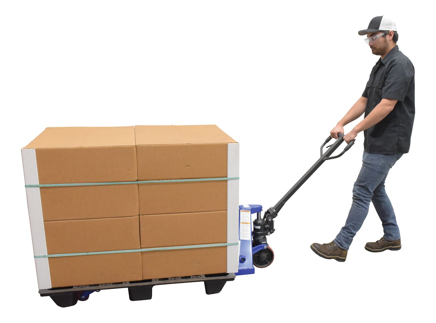 Steel Full Featured Pallet Truck 27 In. x 48 In. 5,000 Lb. Capacity BlueThe full featured pallet truck is an economical way for one person to move heavy pallet loads without the use of a fork truck! Includes two (2) articulating steering wheels and two (2) front load rollers. Reinforced triple-formed steel forks provide twice the strength of standard single-formed forks. The unit is equipped with internally mounted solid steel adjustable push rods. The spring loaded handle automatically returns to vertical position when not in use. Hydraulic pump design facilitates easy-access seal replacement.