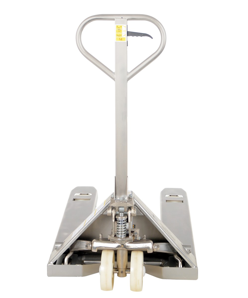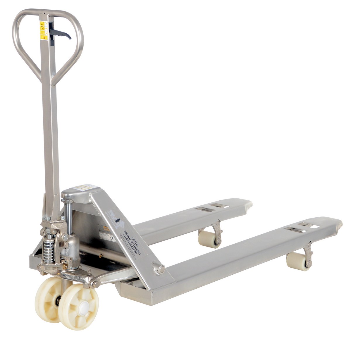 The specialized pallet truck is ideal for sanitary, pharmaceutical, medical, food, and wet environments. Pallet truck has type 304 stainless steel frame and forks for long life in the most harsh environments.