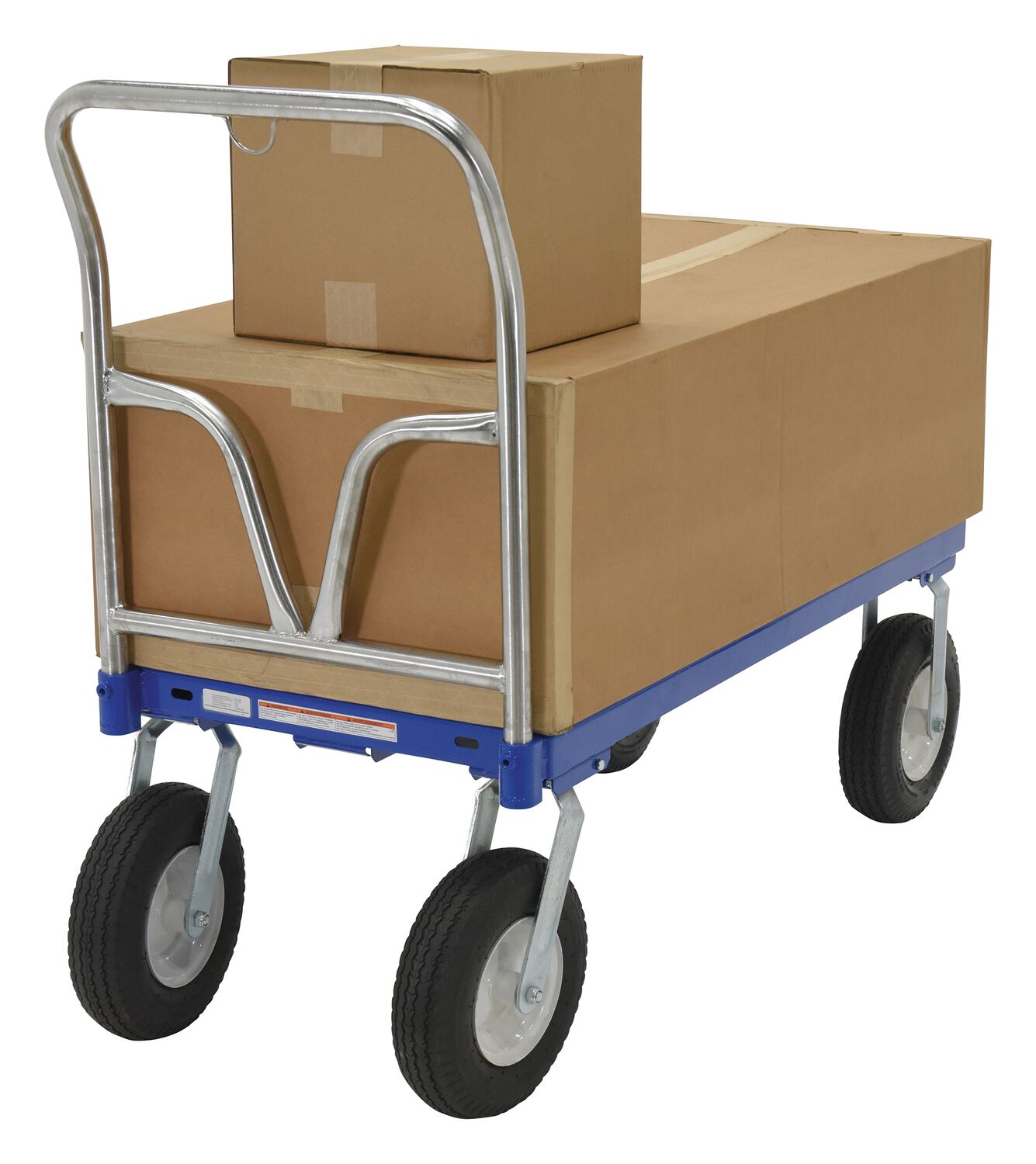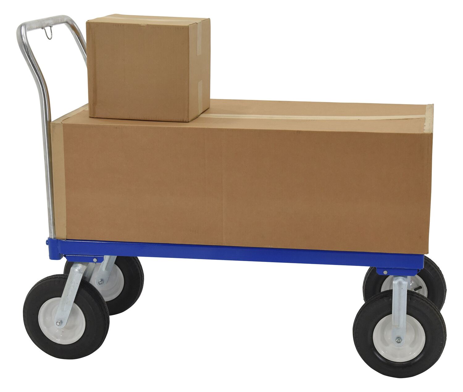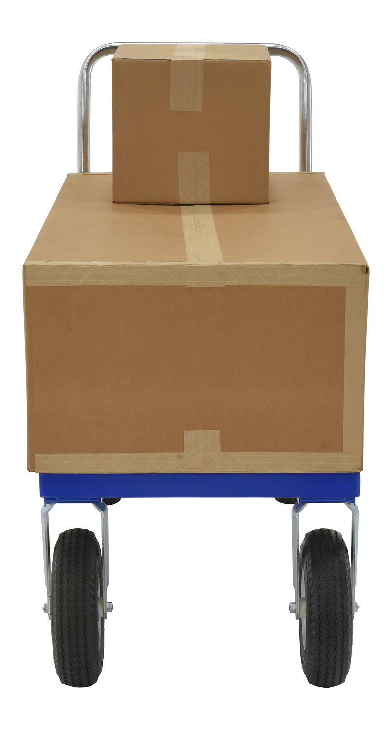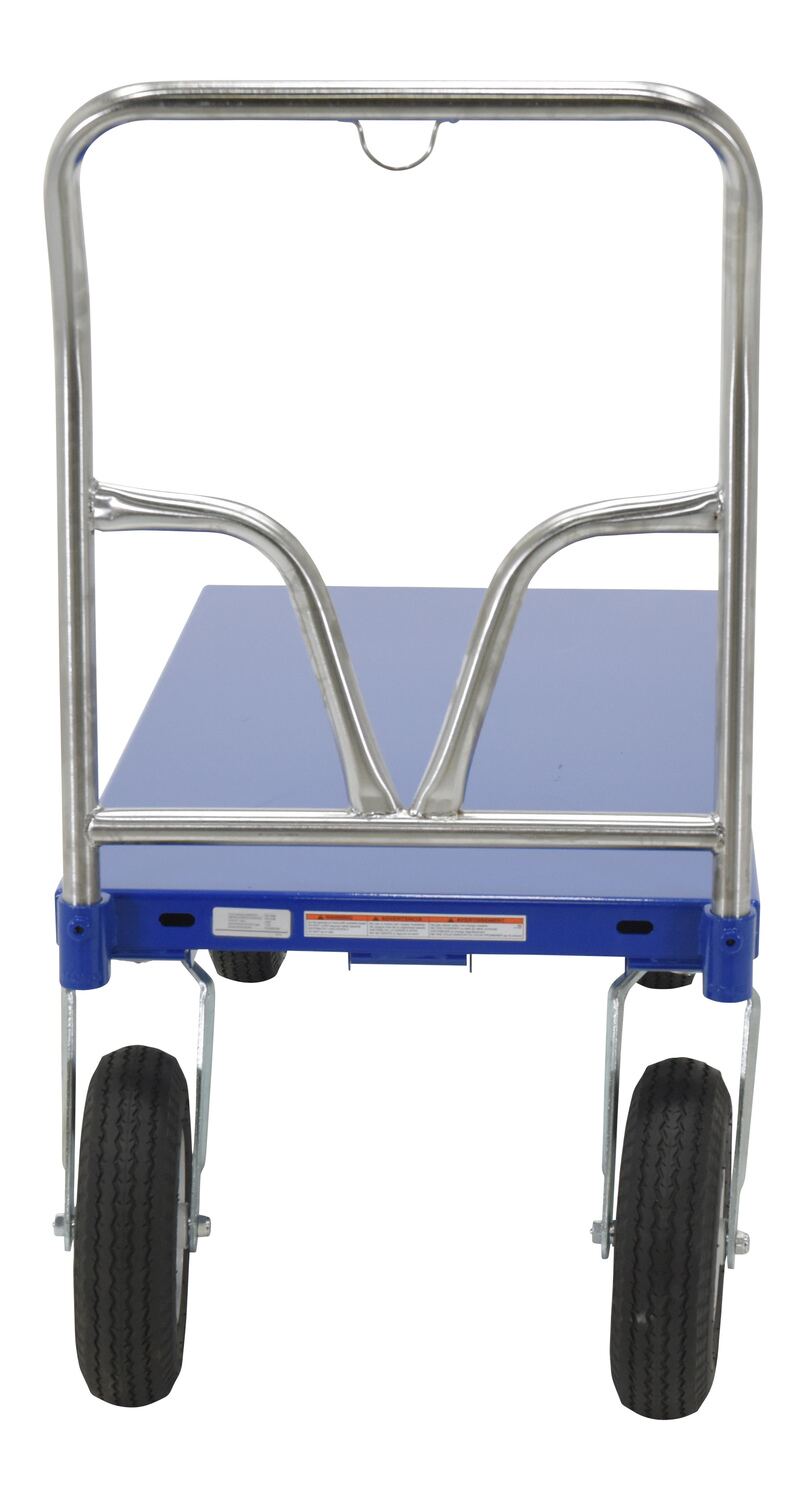 This Pneumatic tire steel Platform Truck travels over rough terrain. Ideal for nurseries, farms, and warehouses. Unit has a removable chrome plated handle and blue baked-in powder-coated toughness.