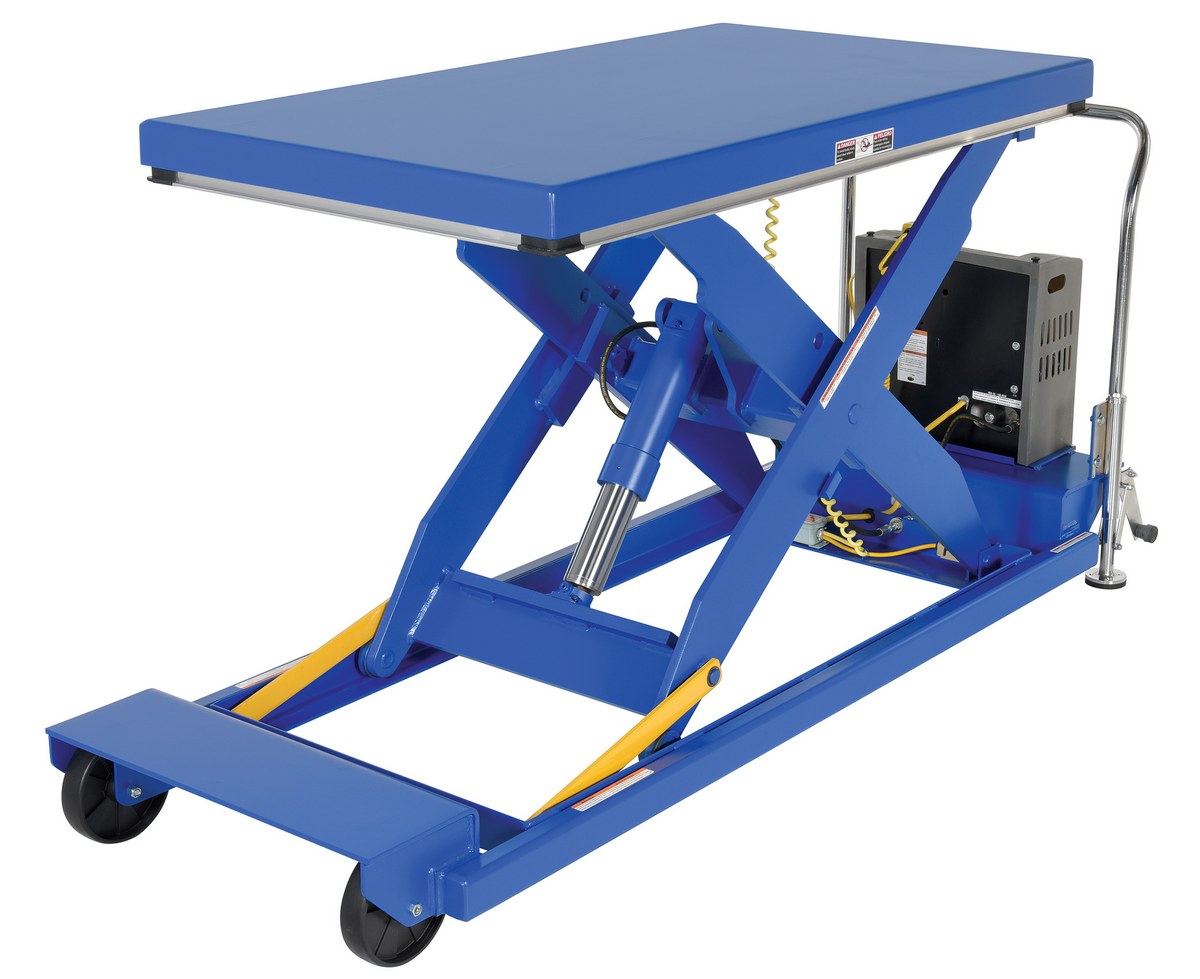 Heavy Duty portable lift scissor tables can easily transport and elevate heavy loads. Featuring glass nylon filled casters (2 swivel and 2 rigid), floor lock, patented electric pinch point guards, and magnetic hand controls. Key-operated on/off control for better security is built into the power unit. Heavy duty 12V DC powered unit with deep cycle battery, an on-board battery charger and battery charge indicator gauge comes standard.
