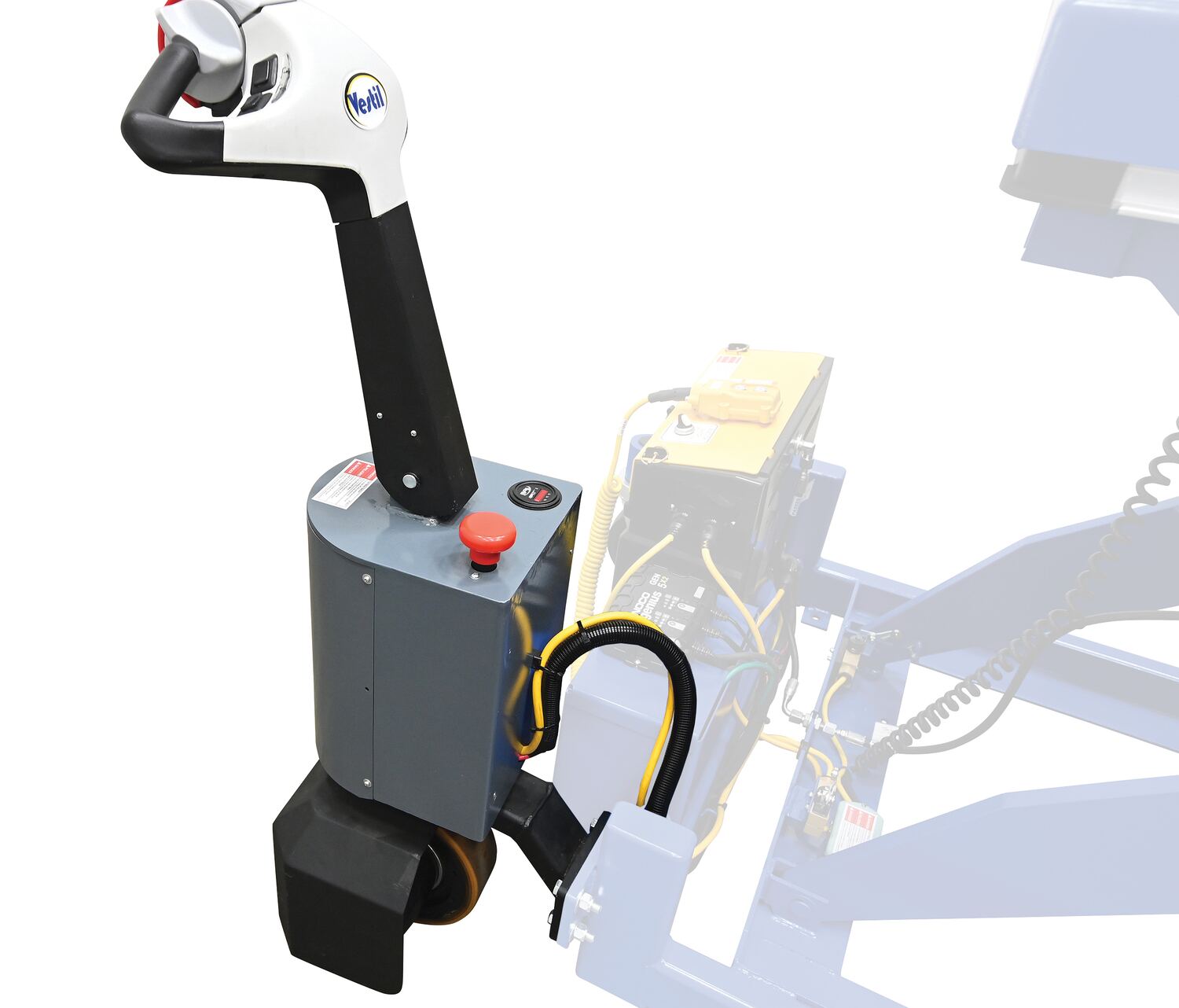 Optional Power Traction Drive system has a combination throttle/direction butterfly style controller and an adjustable yoke. The traction drive system also features an auto reverse emergency "belly" switch.