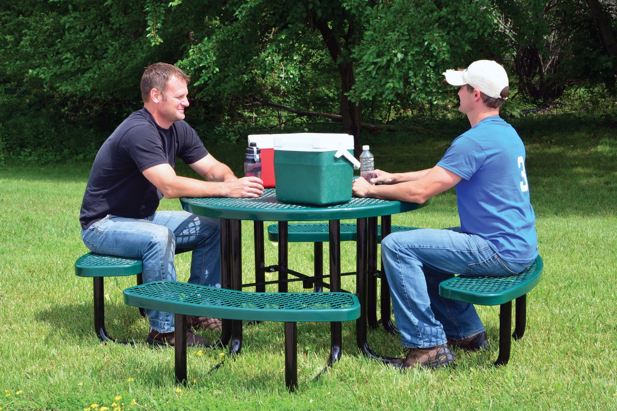 Steel Picnic Table Expanded Metal Round Top 46 In. x 46 In. GreenBuilt to last and highly attractive, this commercial grade metal picnic table is constructed of expanded metal that features a diamond pattern. Finished to endure the elements with virtually no maintenance. Tops and seats are coated with a rugged thermoplastic layer that's attractive and durable. Galvanized tubular steel legs and supports are protected with a black powder coat finish designed for strength and stability.