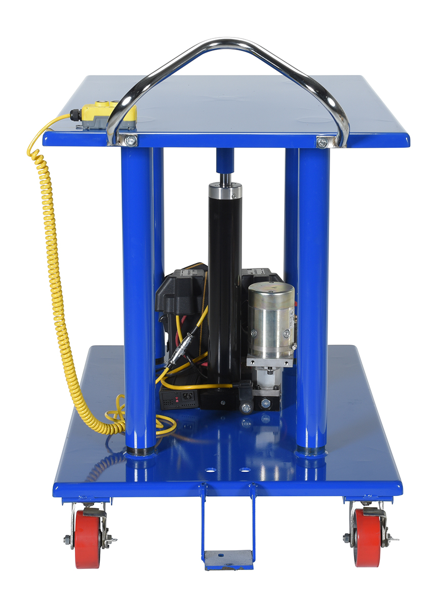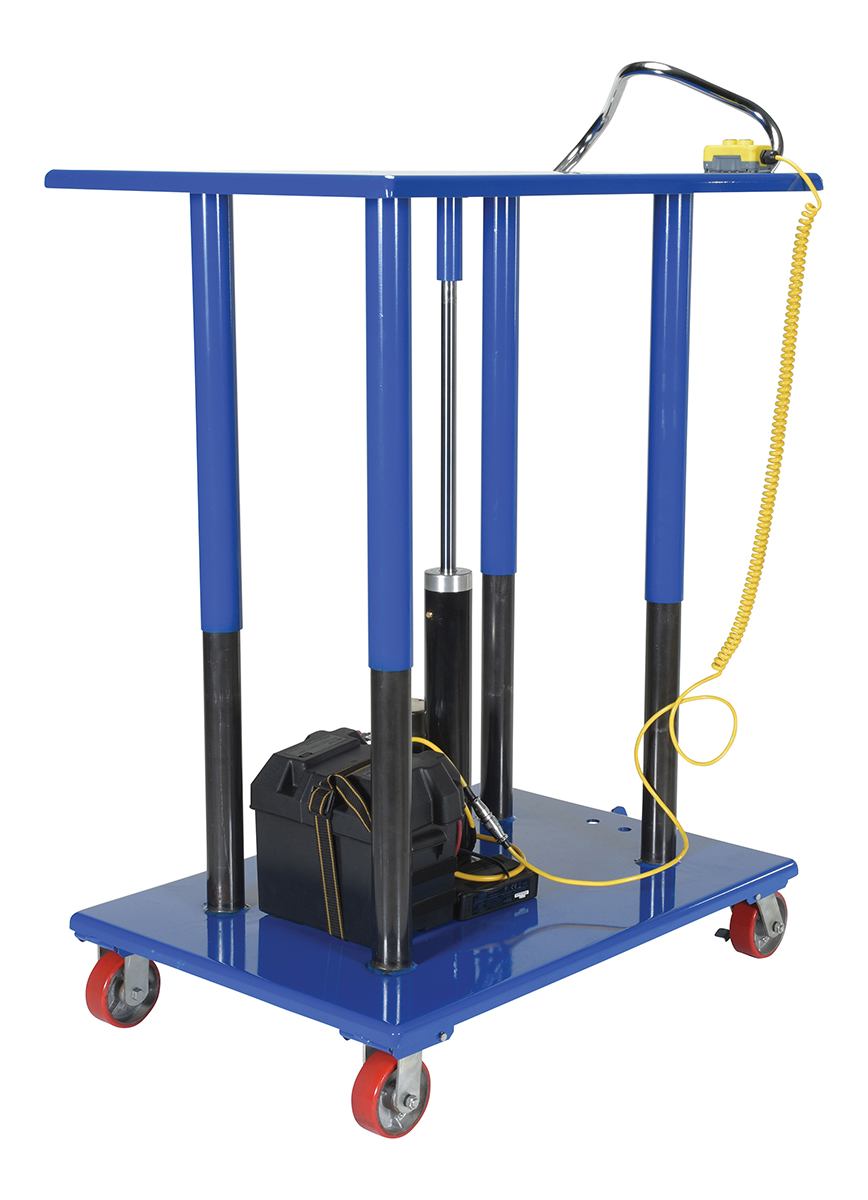 Hydraulic post tables are ideal in material handling facilities. The unit can be of use in a variety of environments from lifting dies and castings to moving machine parts. The corner posts are telescoping to help stabilize and fully support the load during operation. The tables roll smoothly on two (2) locking swivel casters with brakes and two (2) rigid. The tables can be lifted/lowered with a single speed foot pump, two-speed foot pump, two speed auto shifter that automatically shifts when the table is loaded, or linear actuated power.