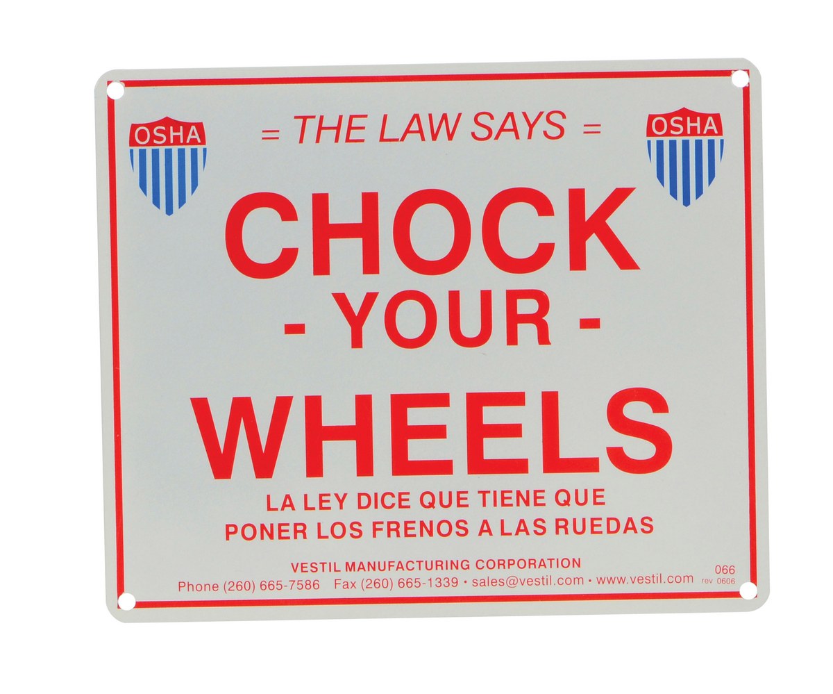Optional Aluminum enamel Wheel Chock sign warns trucks and dock workers to chock their wheels as required by law. The sign has four (4) mounting holes.