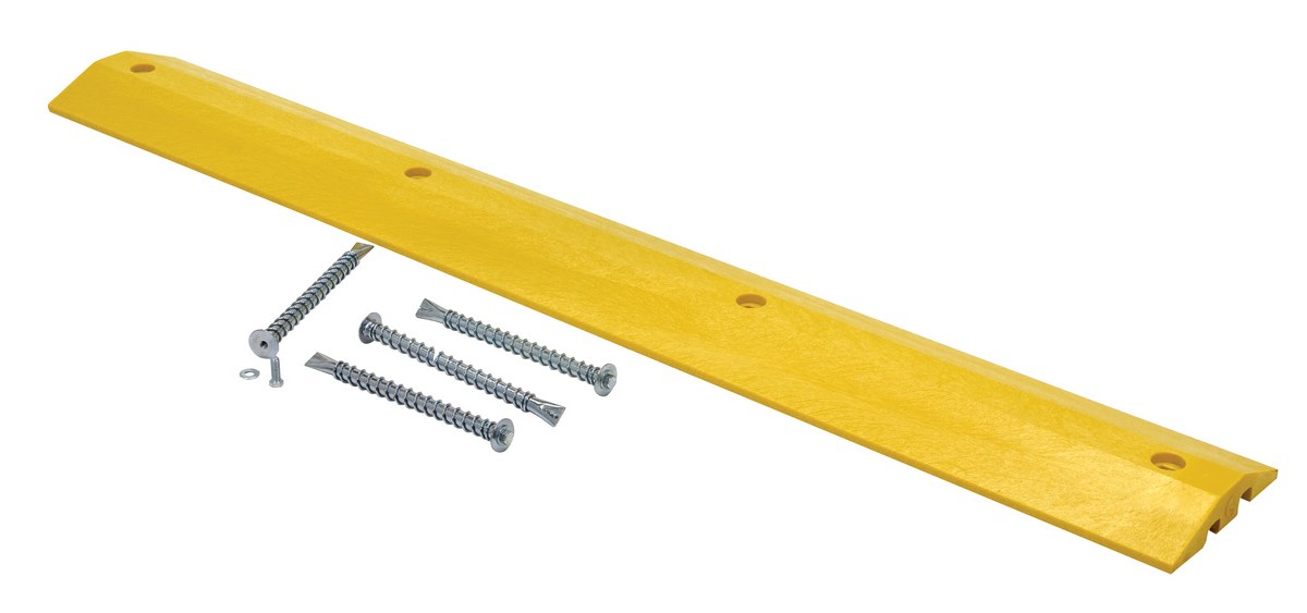 The speed bump is ideal for a variety of parking areas, both inside and out. The speed bump helps to control drivers from injuring people and property. The unit can be installed/removed by one person resulting in smooth portability. The strong recycled plastic construction can be used where traffic is frequent and can hold up to the constant day to day harm from chemicals and sunlight. Features a dual cable channel. The HD asphalt kit includes anchors, bolts and washers. The HD anchor should be epoxied (epoxy not included) into the ground and then the speed bump is secured to that anchor with a bolt and washer.