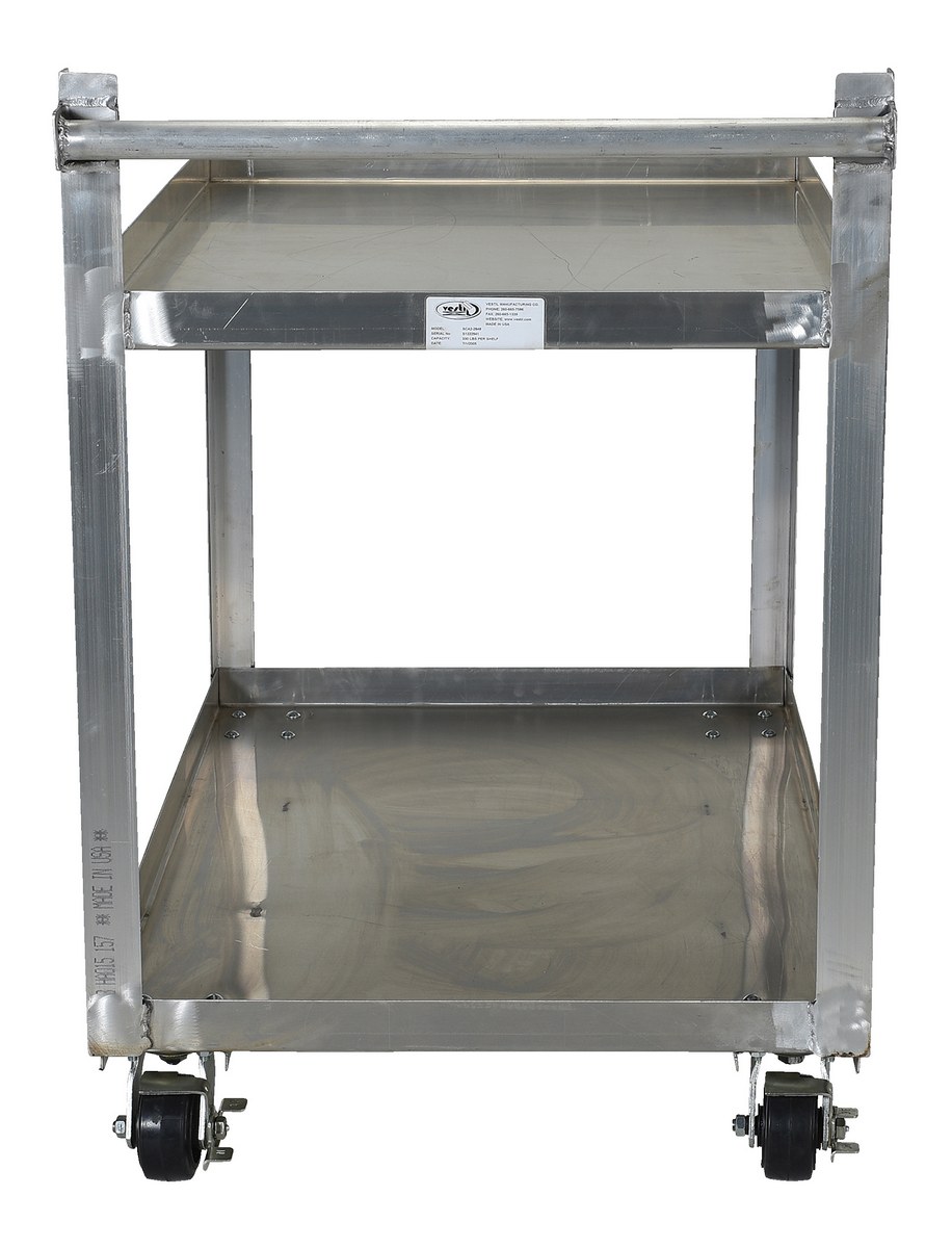 All welded service cart, made of aluminum is ideal for transporting parts and boxes. This unit has two (2) shelves, a lip is turned up on all shelves to prevent items from sliding off.